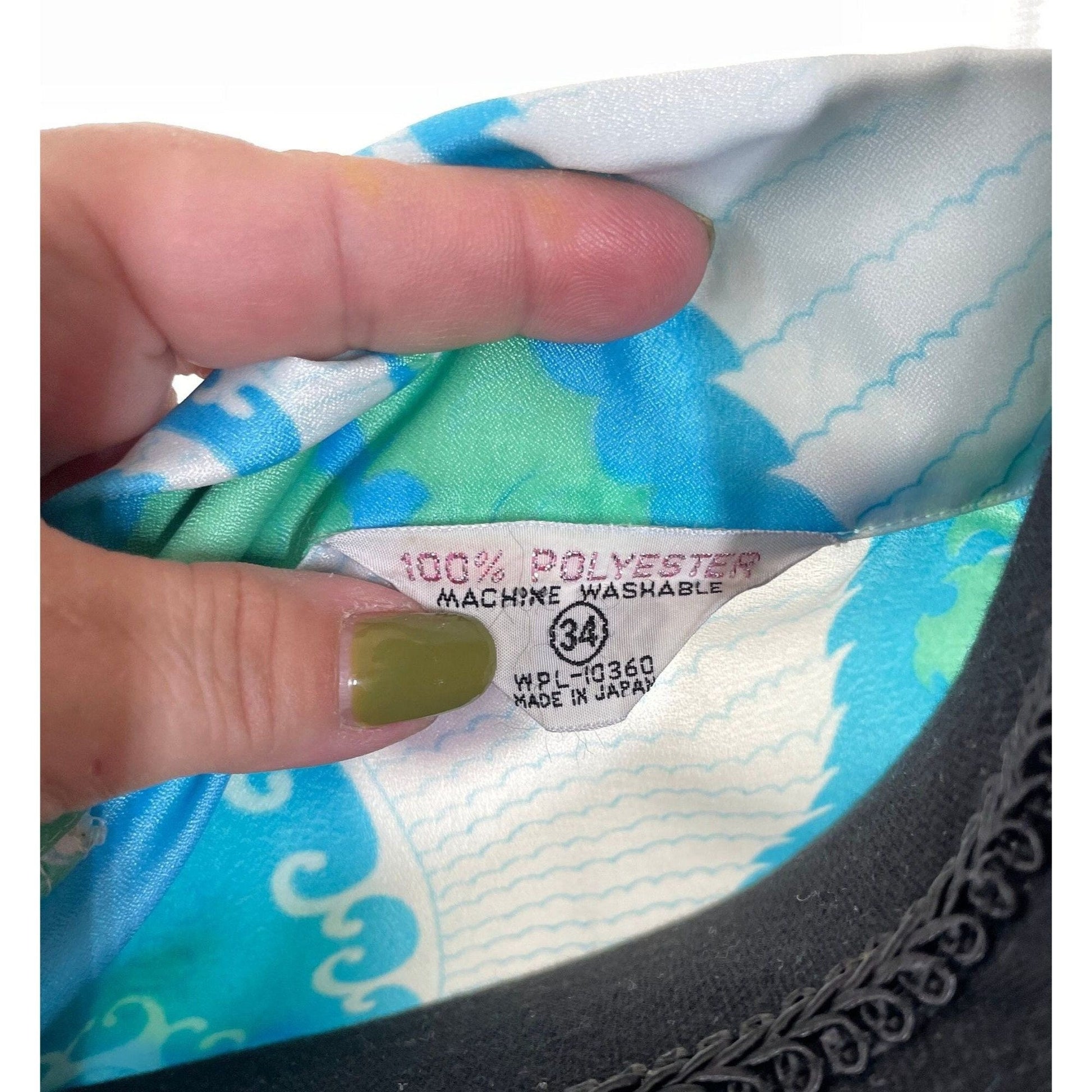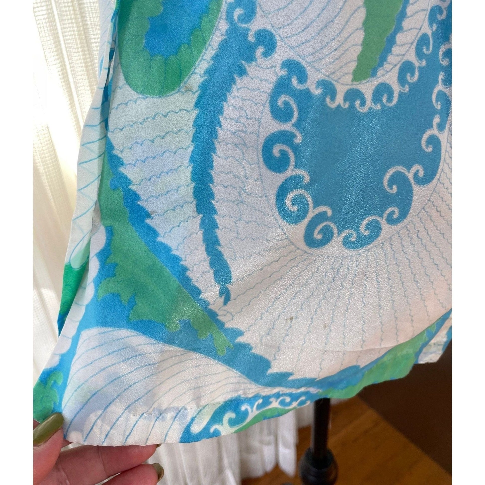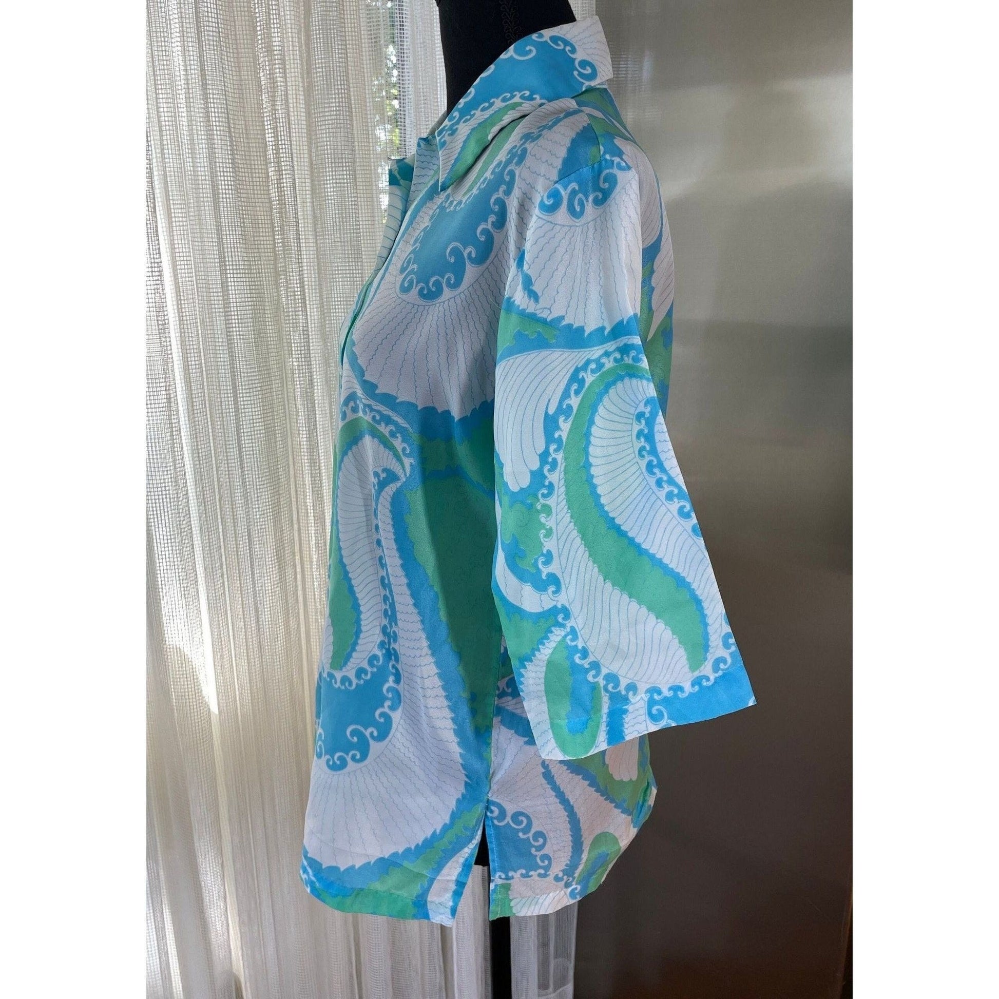 Vintage 70s blouse, large blue green paisley, 3/4 length sleeves