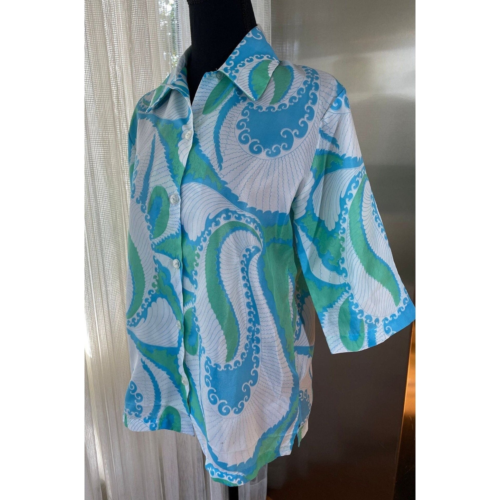 Cute 70s paisley green and blue on white buttoned up shirt;