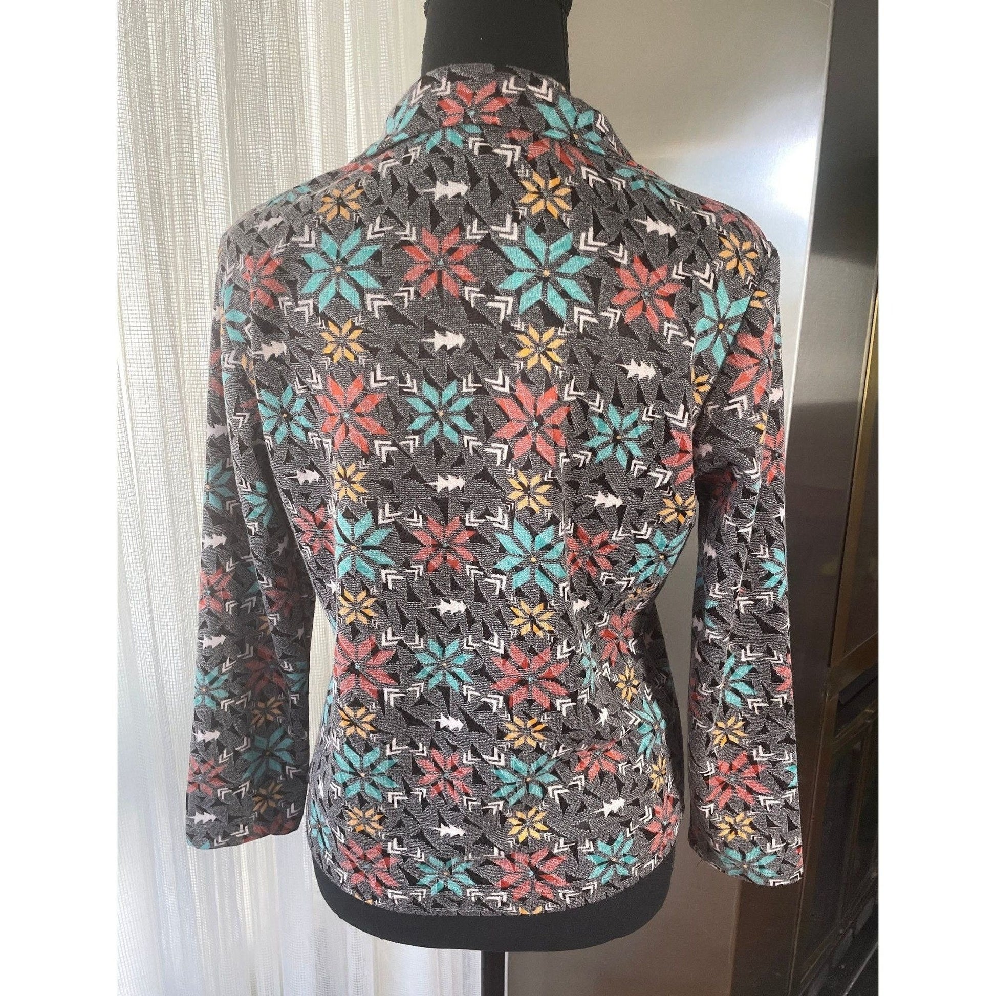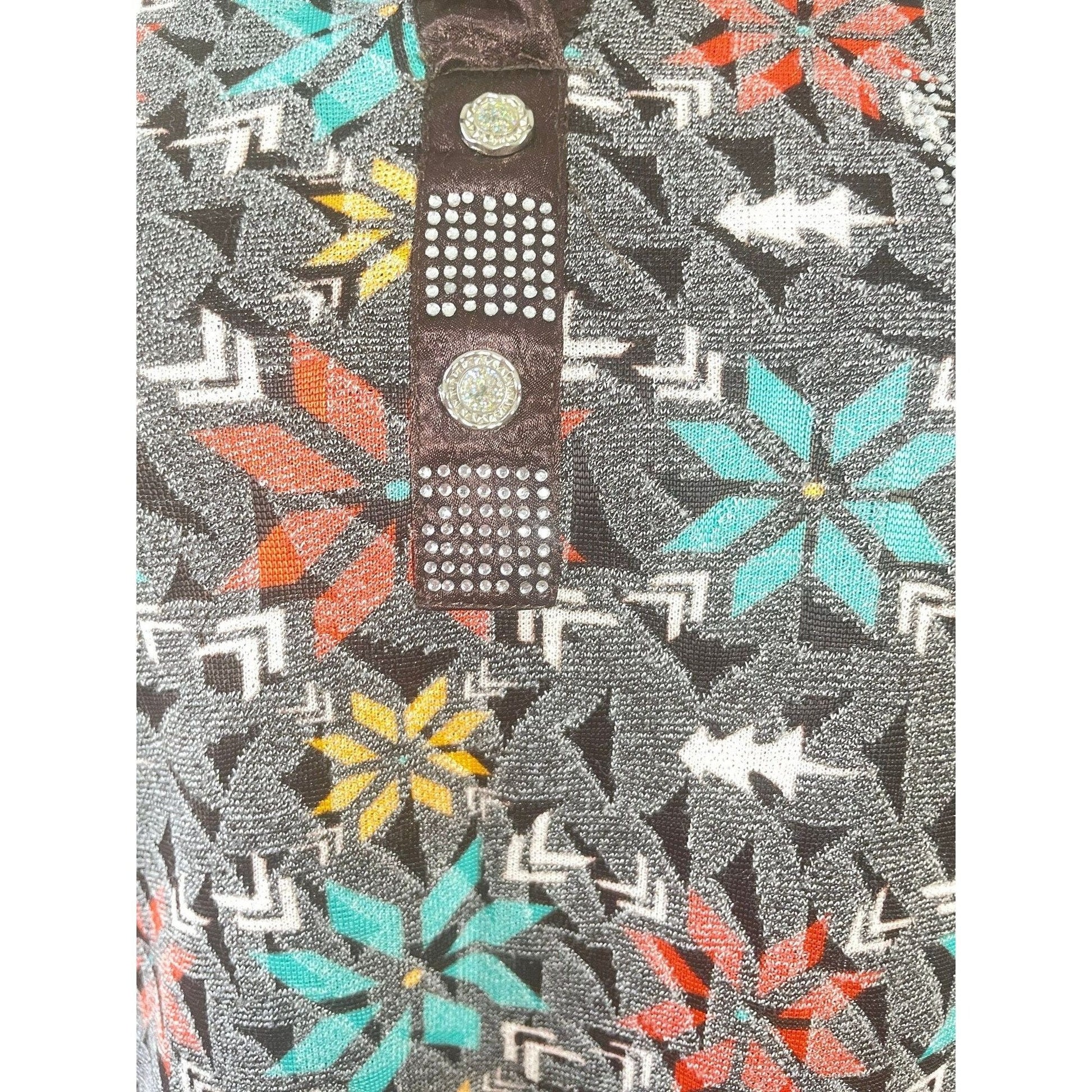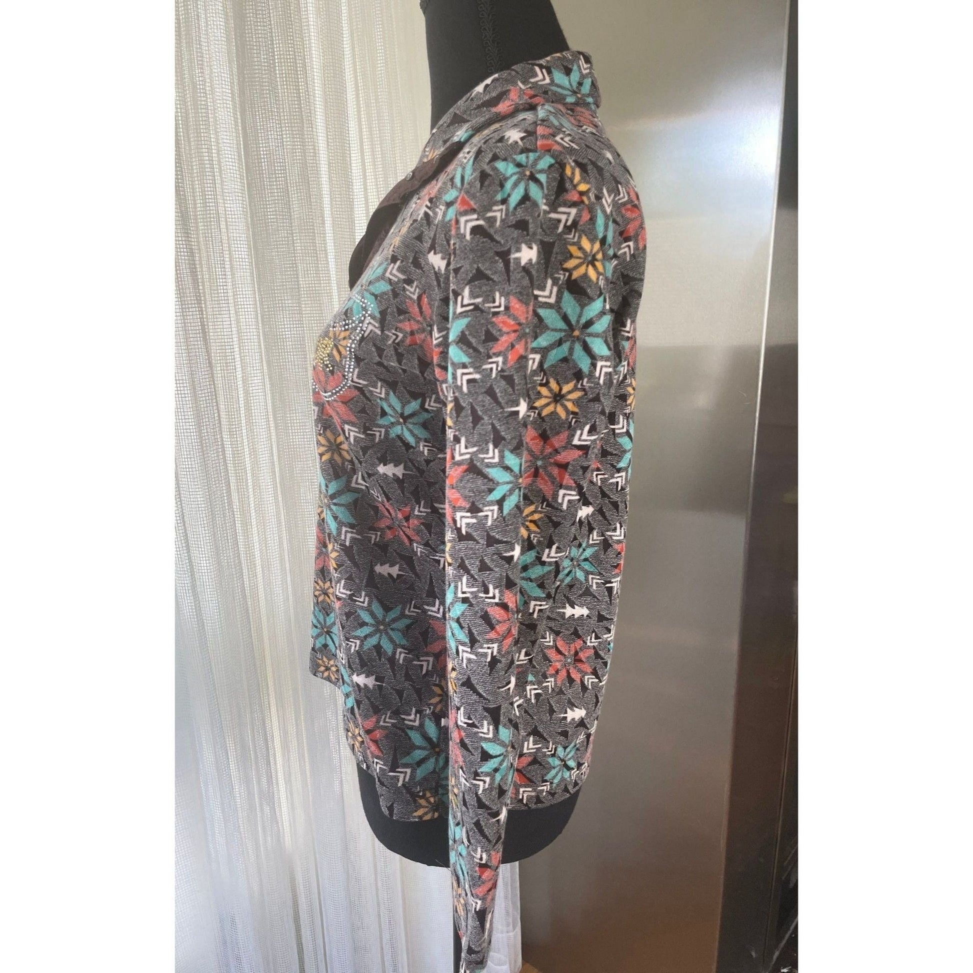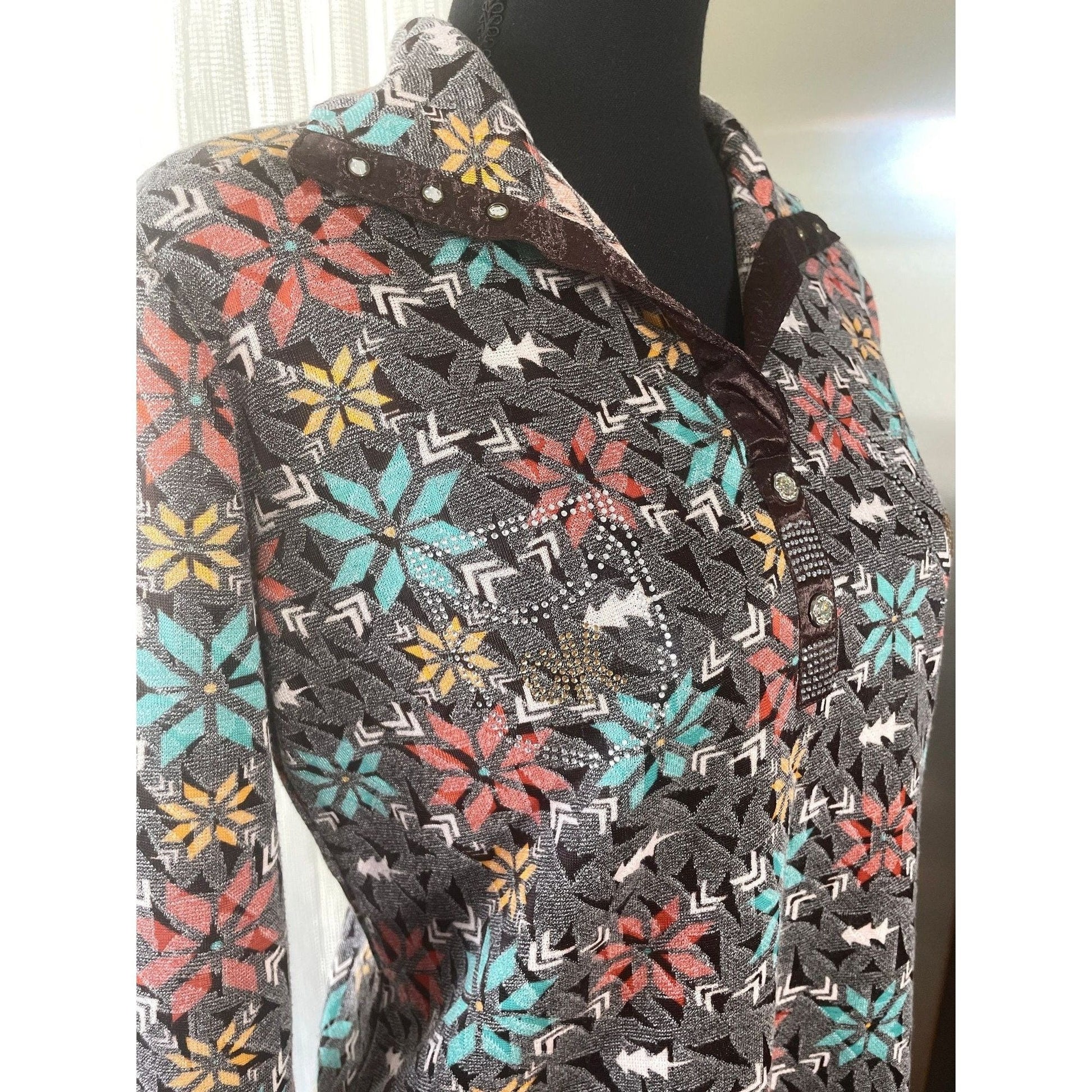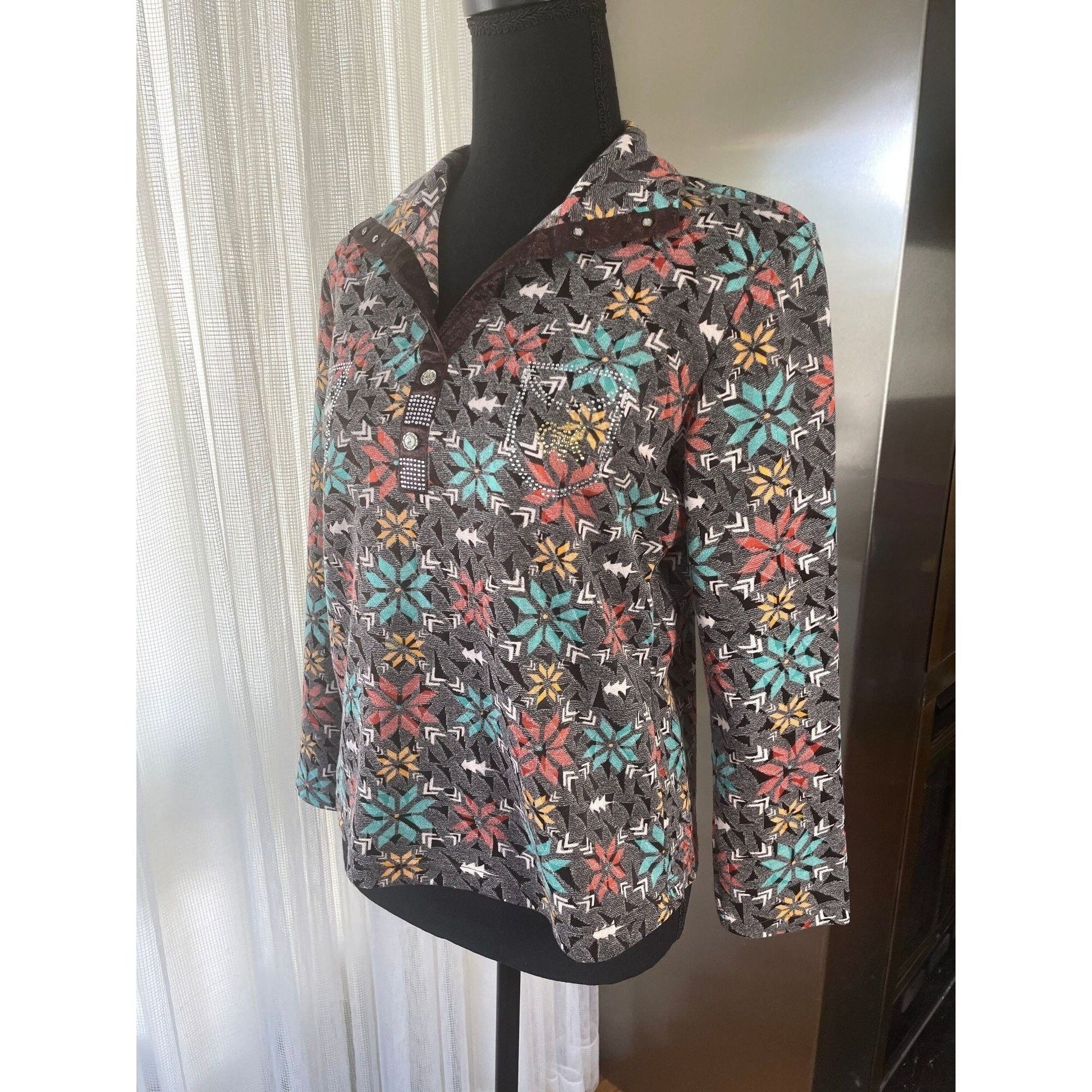 V neck collar with long sleeves, pattern is abstract flowers and tone on tone texture. Glitter on the front near the buttons and making faux pockets. Studs on the satin collar.