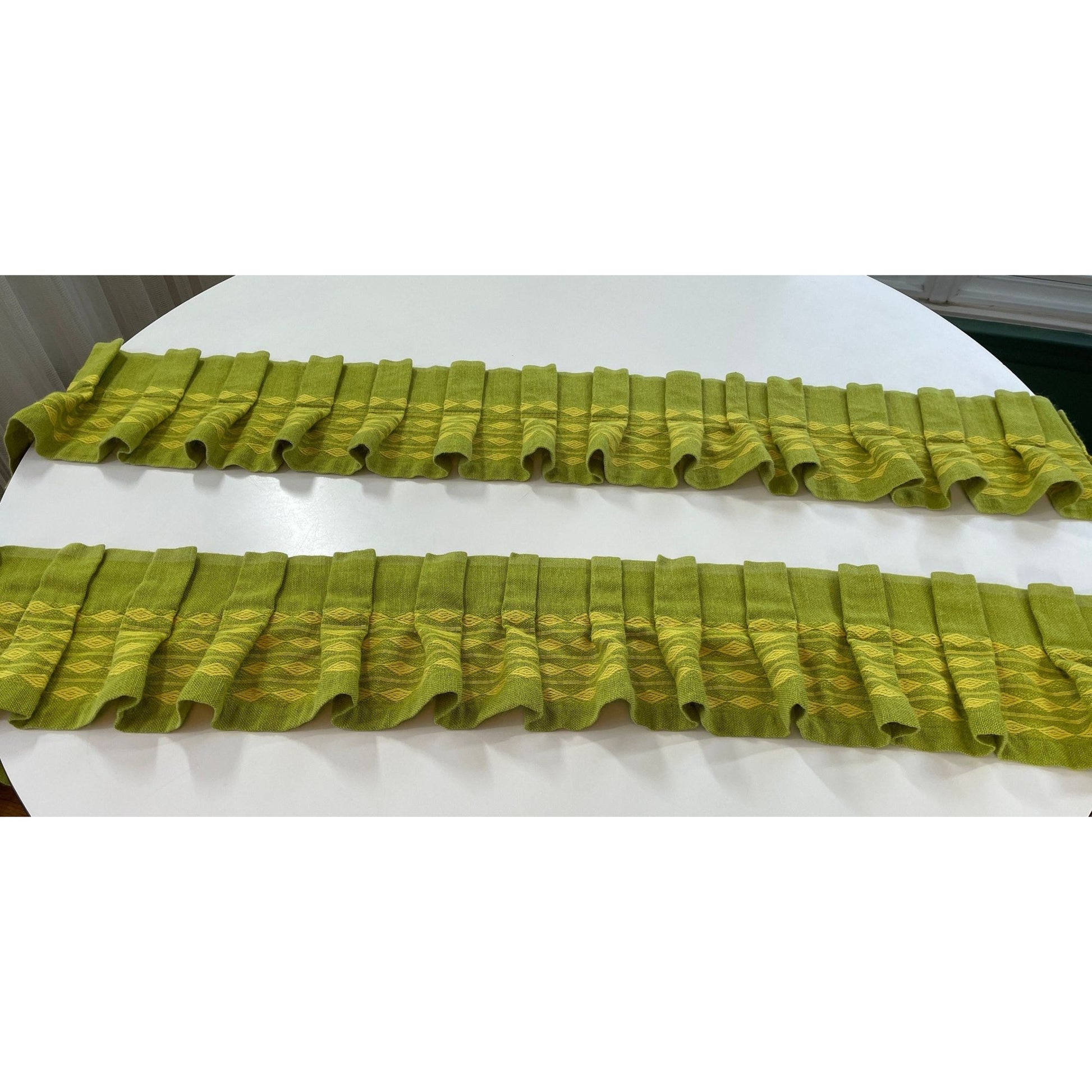 Unusual inverted flat pleats, the valances has two shades of green: olive and lime, almost yellow.