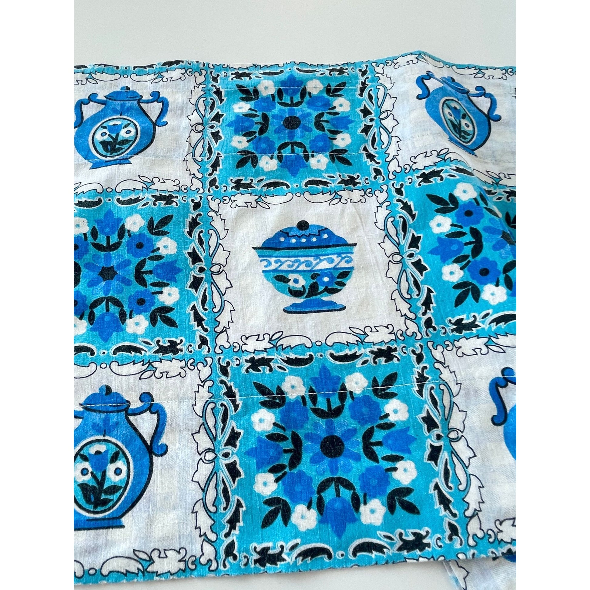 Different shades of blue and white large faux patchwork. Prints of teapots, flowers and bowls.