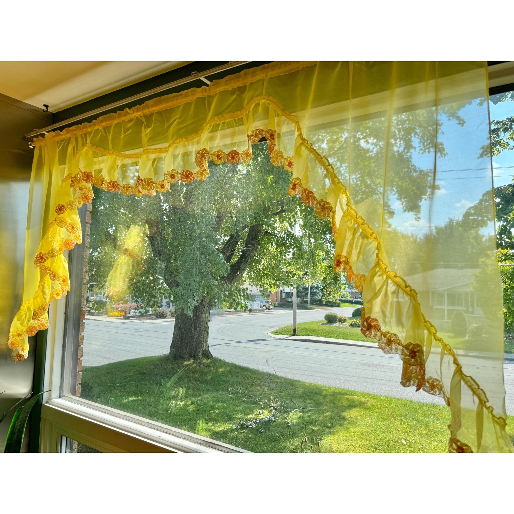 Very wide swag with an asymmetrical cut, longer on each side, the panel is bright sunny yellow with orange and yellow embroidered daisies ruffles at the bottom, making it a scalloped edge.