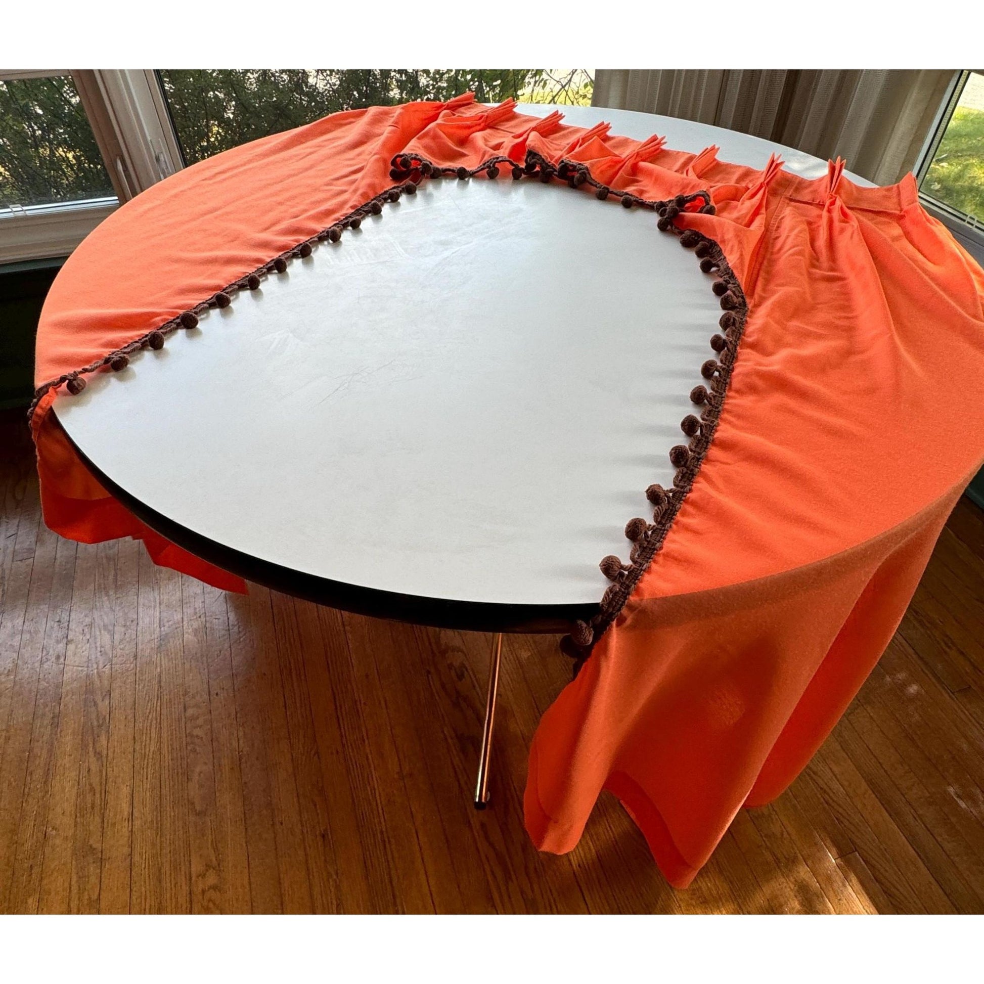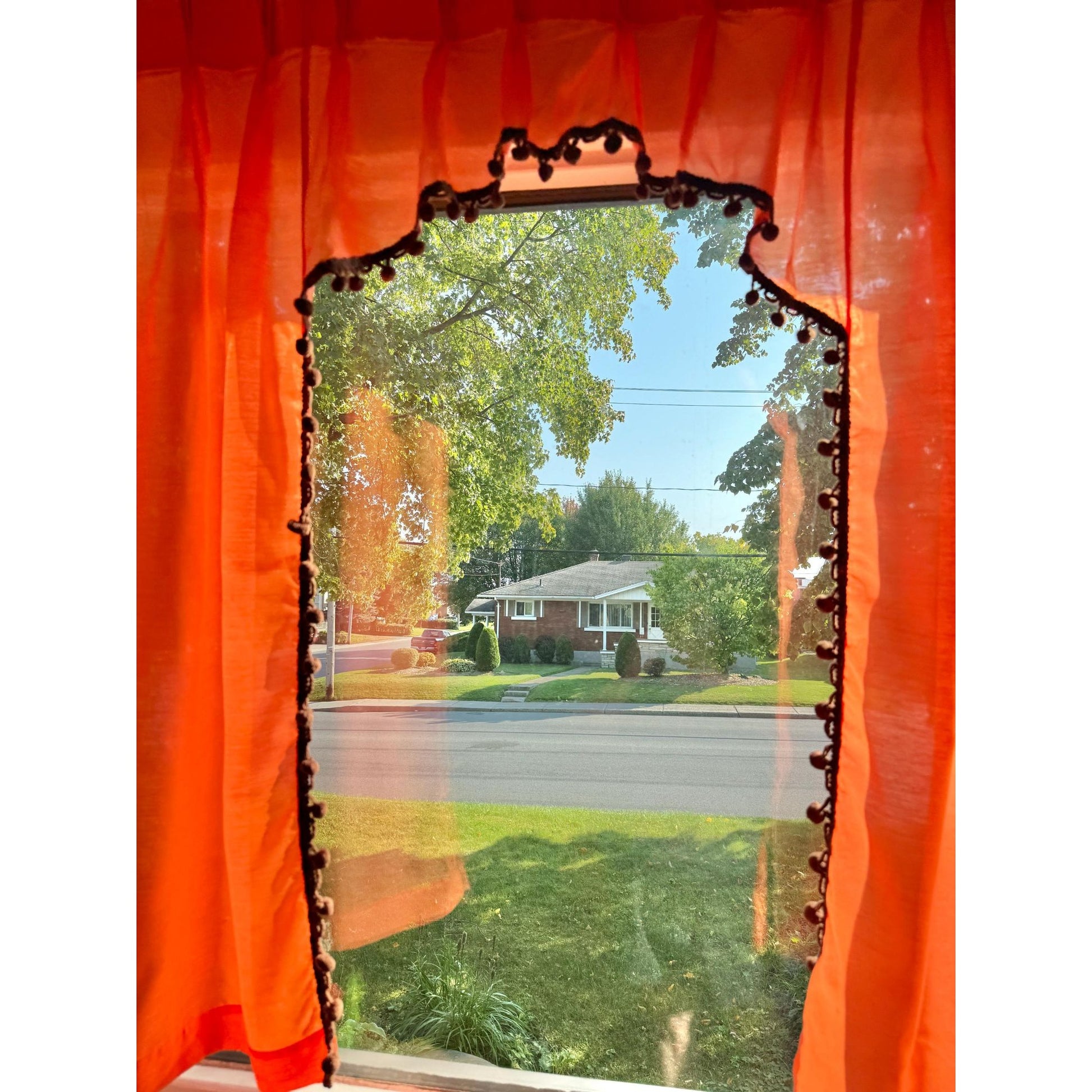 Swag with an asymmetrical cut, longer on each side, in gorgeous tangerine orange, this valance has a pom pom fringe at the bottom in chocolate brown.
