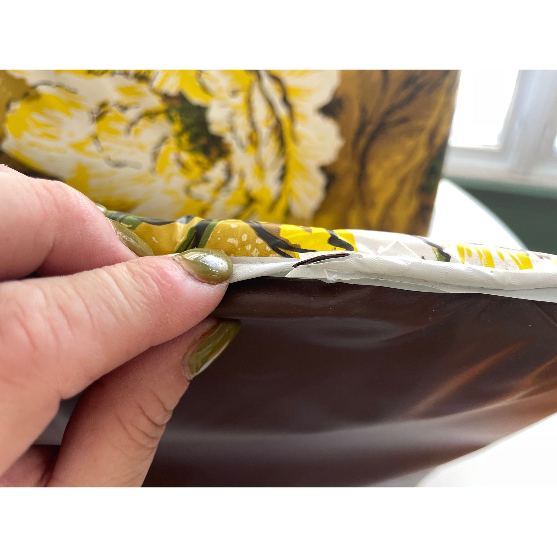 Vintage 70s vinyl lounge chair vinyl cushion, brown, green yellow flowers