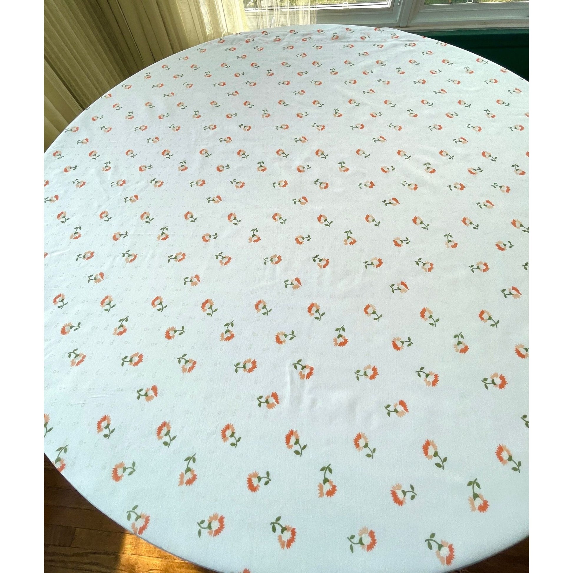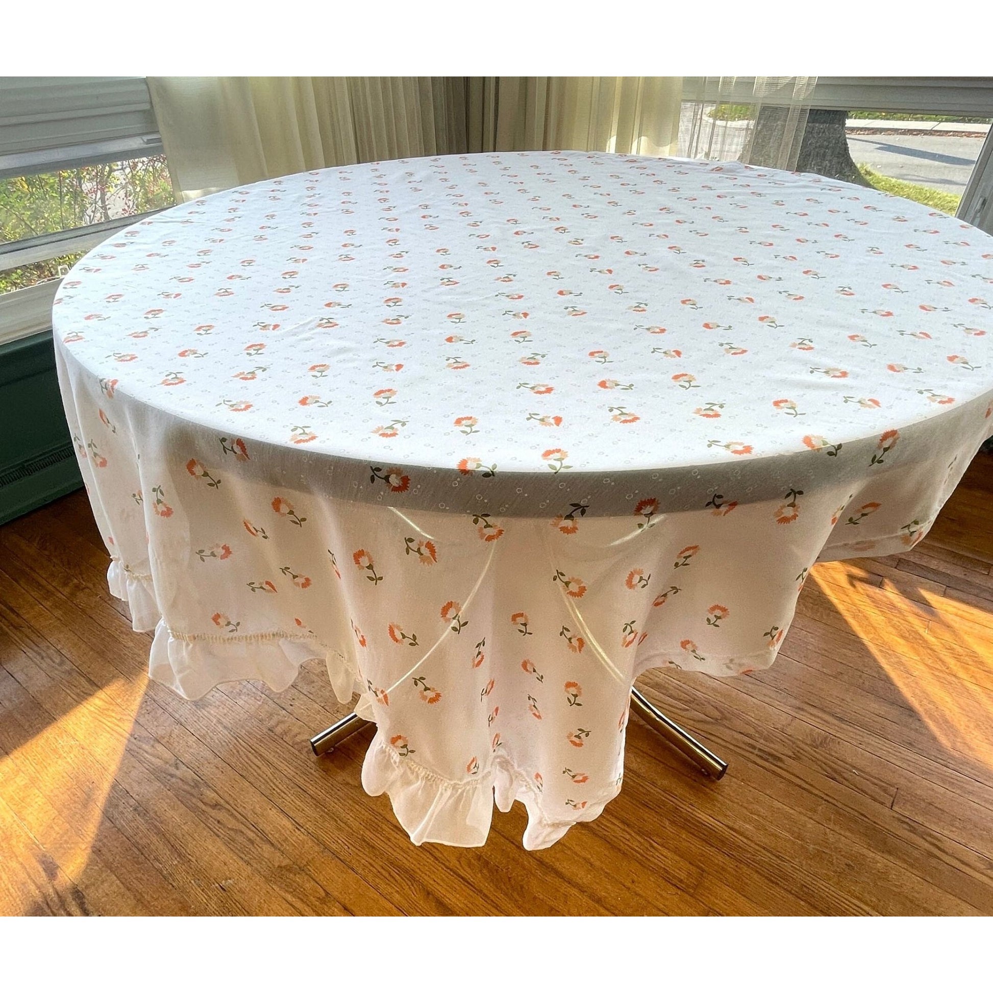 White with orange and green flowers. Panel has ruffle on bottom.