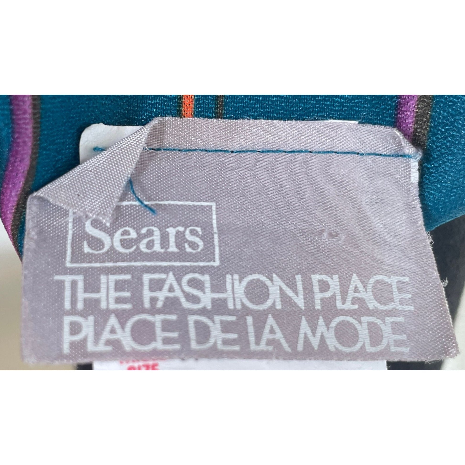 Adorable office wear dress from the 80s, deep turquoise and pink stripes with long sleeves and elastic waist over pleated skirt. Made in Canada by Sears, it has plastic decorative pink buttons on one shoulder and an assorted rope belt.