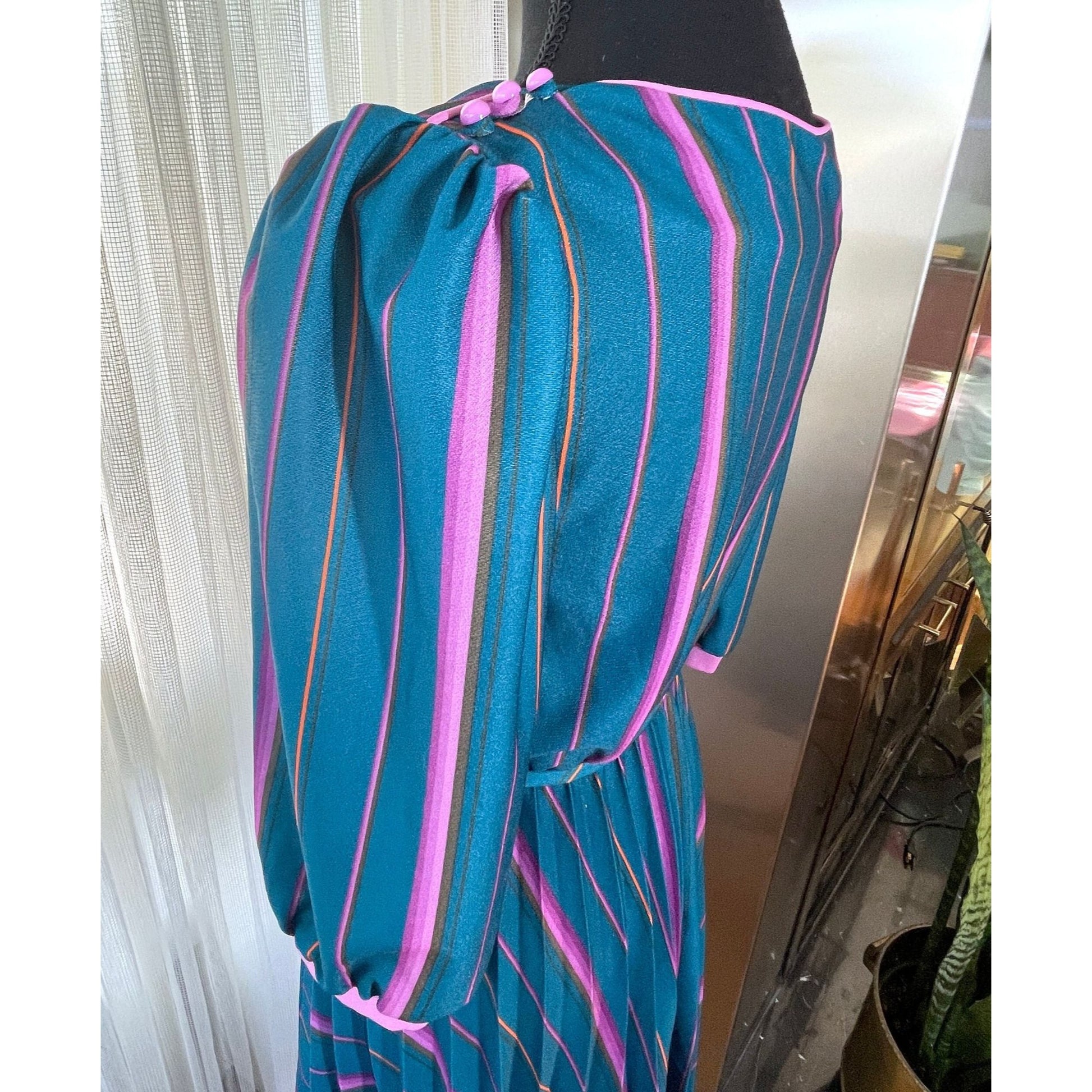 Vintage 80s dress, turquoise and pink stripes, long sleeves, pleated skirt