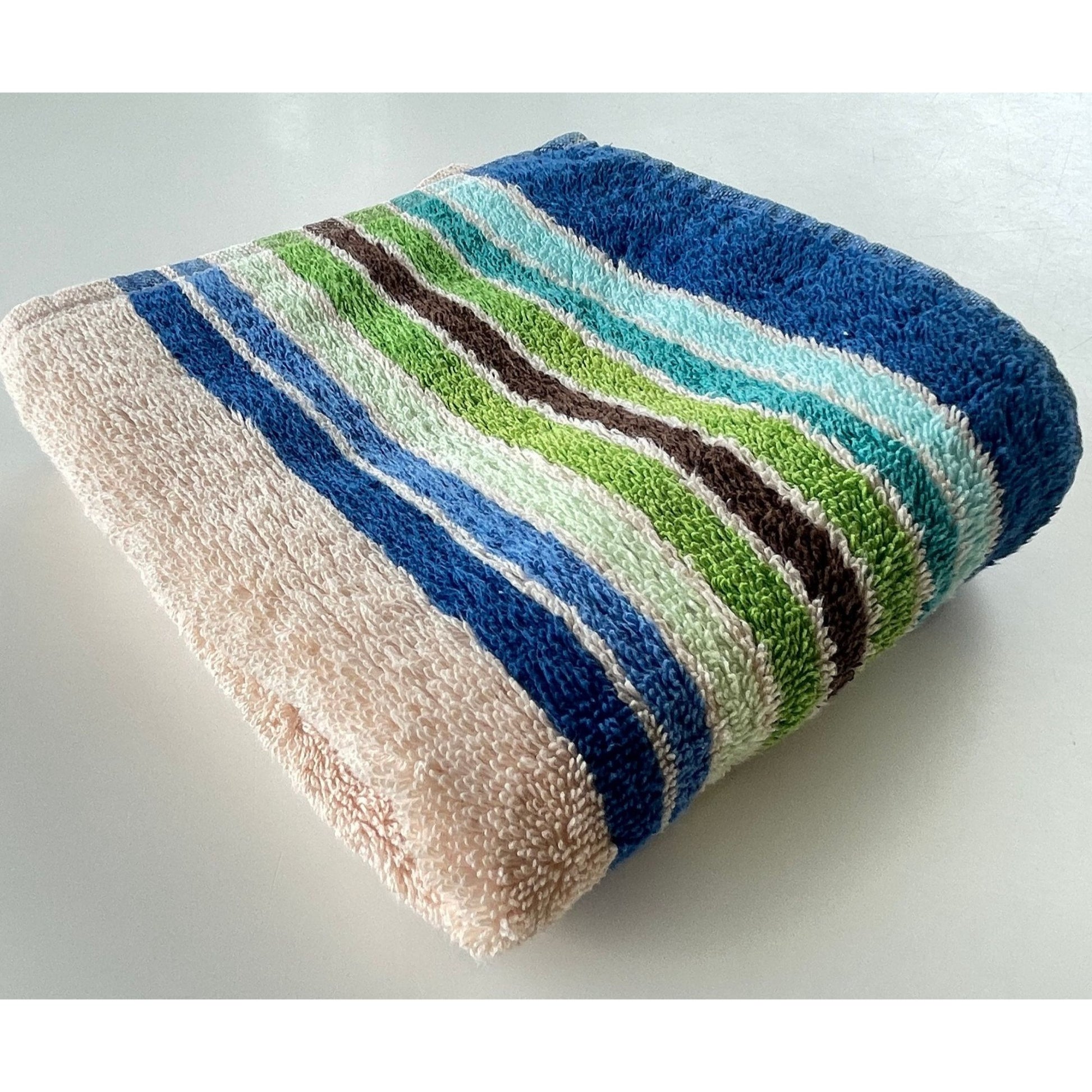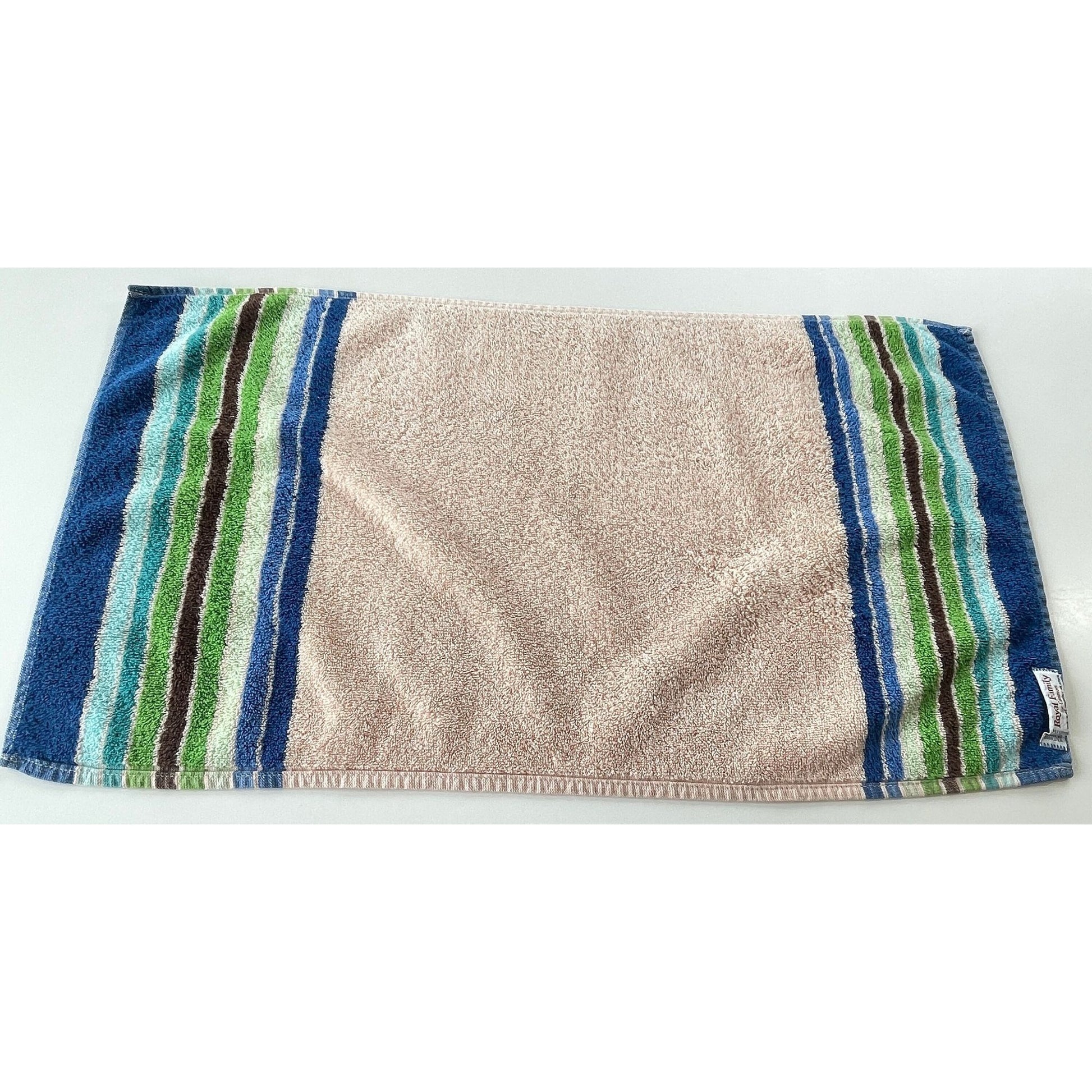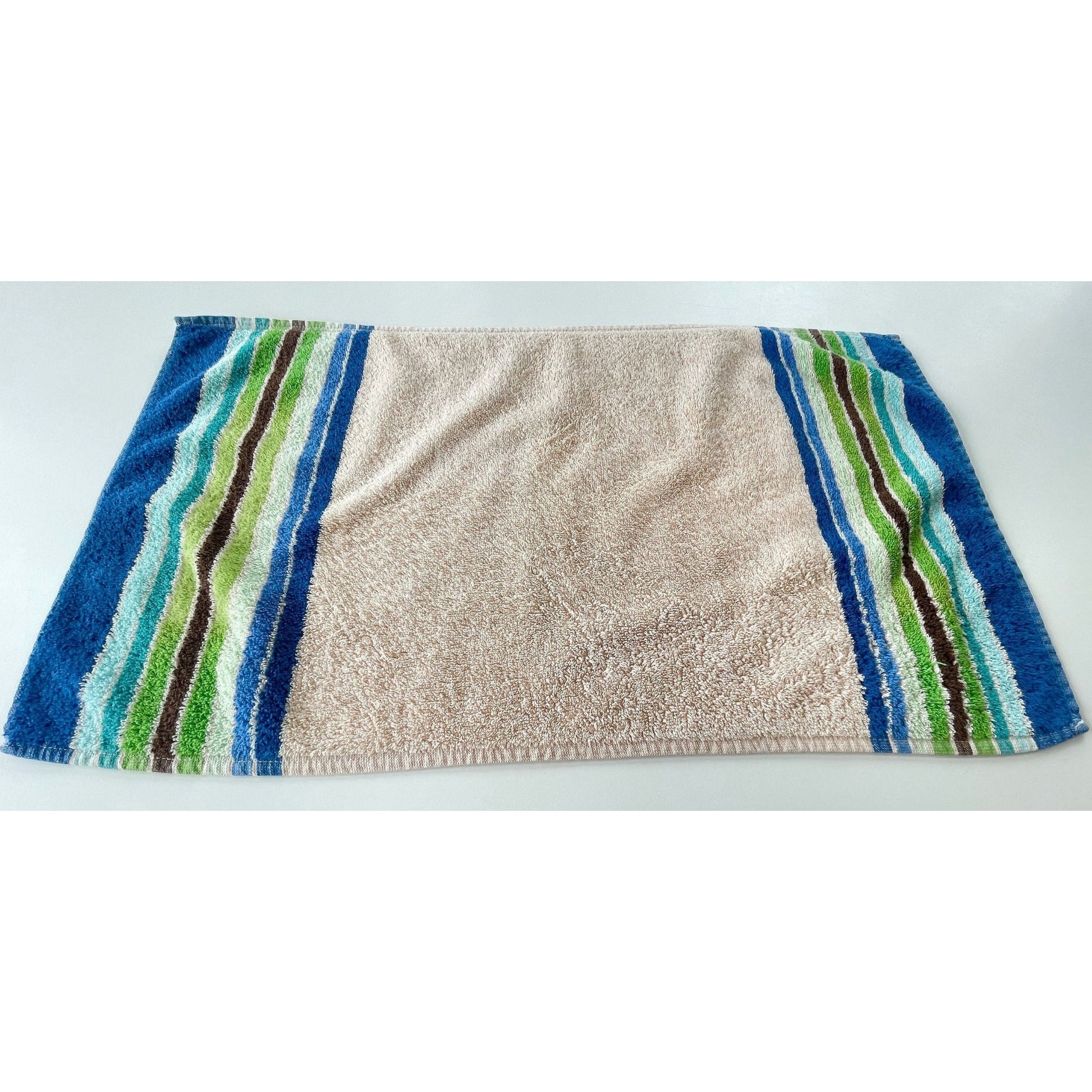 Vintage hand towel, from the 80s, terry cloth, tan background with green brown and blue stripes on both ends.