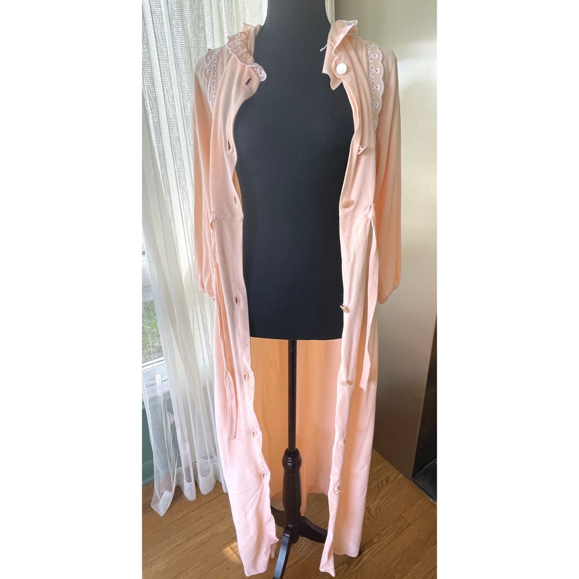 Lovely 80s peachflannel robe, made in Canada by Hamilton Lingerie. Label indicates size medium however it is quite roomy. Ankle length, with full length front buttons, has one side pocket. It also has an assorted sewn in belt, lovely ruffled neck and bib, with white eyelet details on the ruffles.
