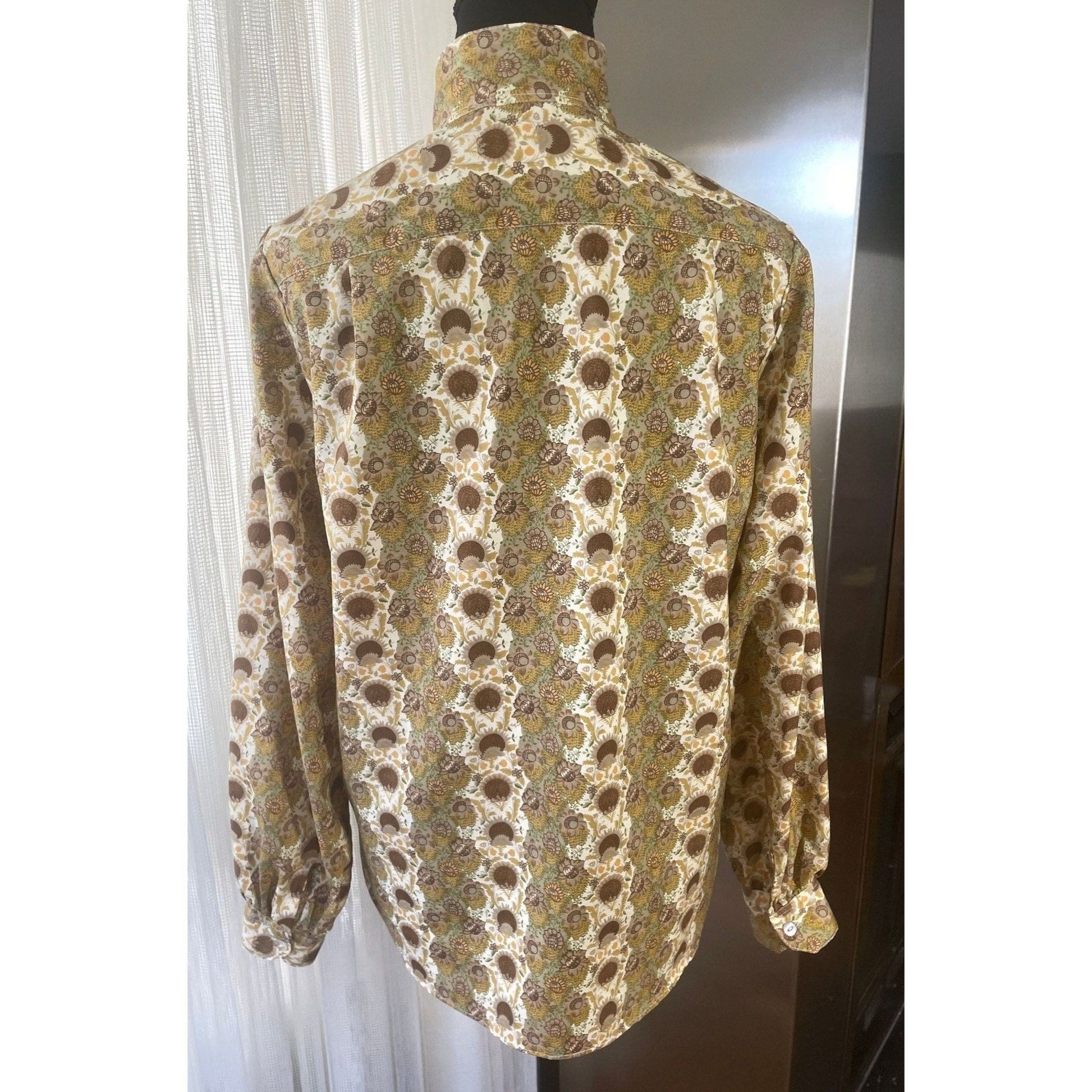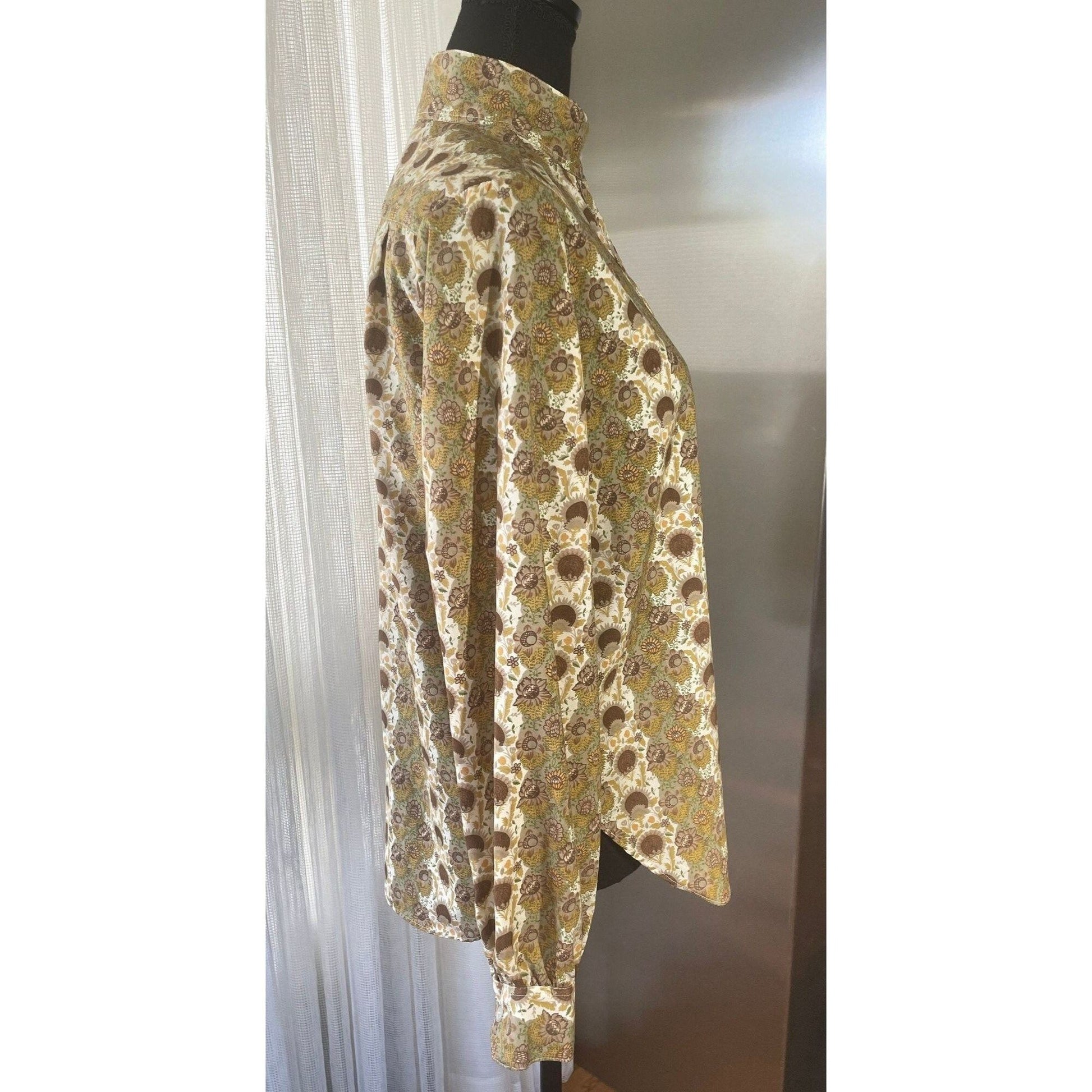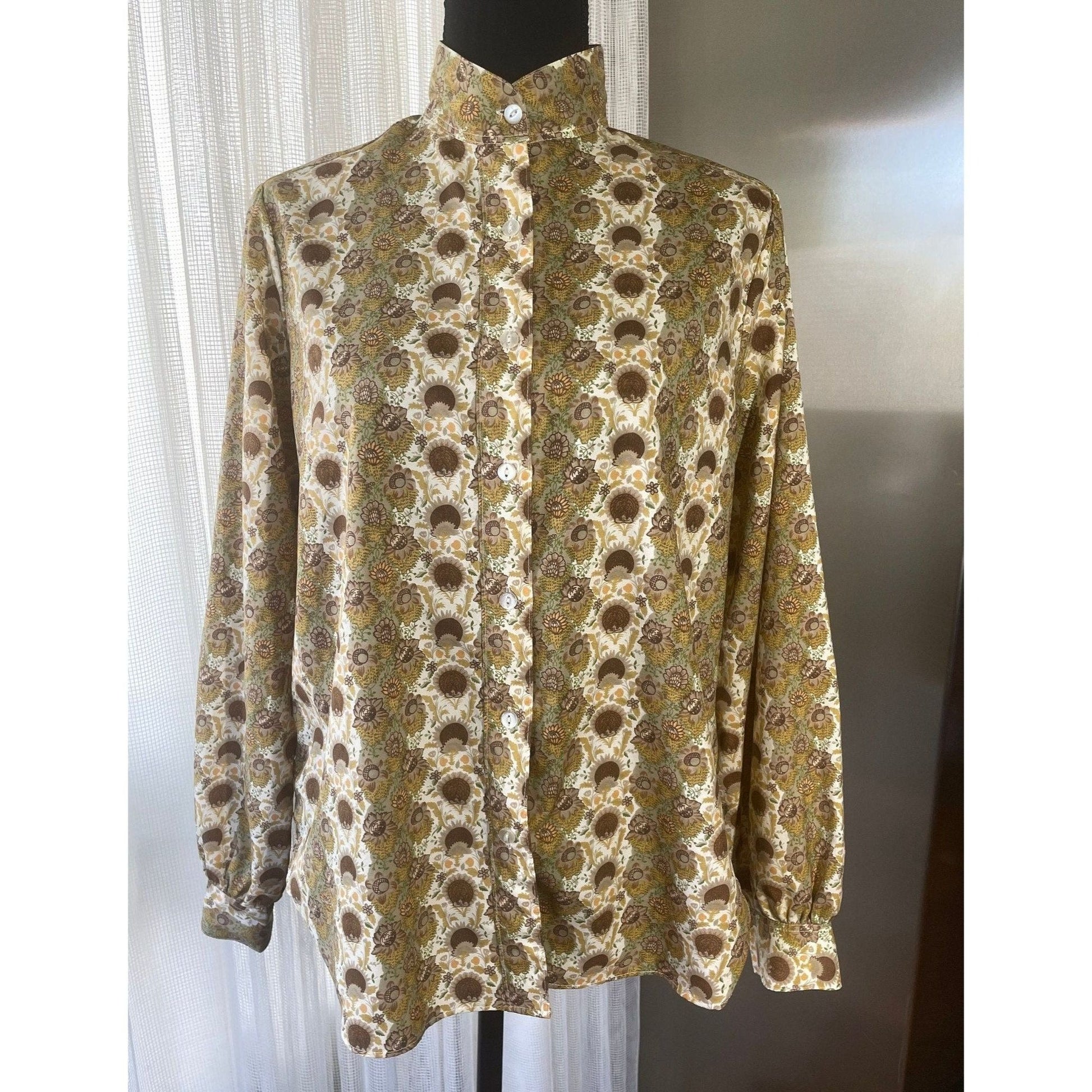 Vintage 80s satin blouse, green sunflowers pattern, long sleeves
