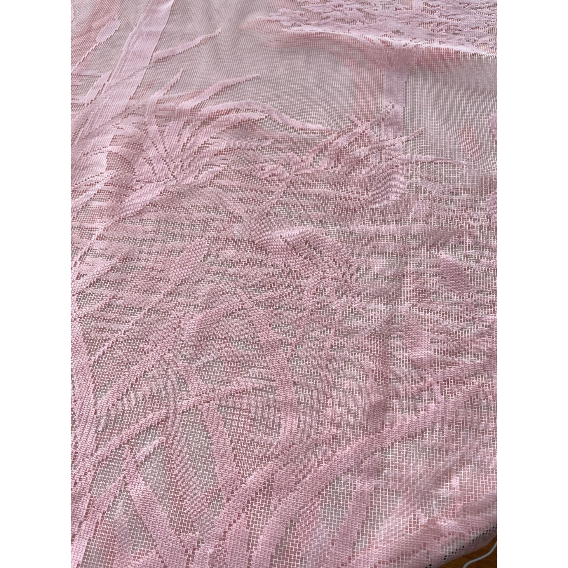 Decorative mesh shower curtain, pink with tone on tone silhouette pattern.