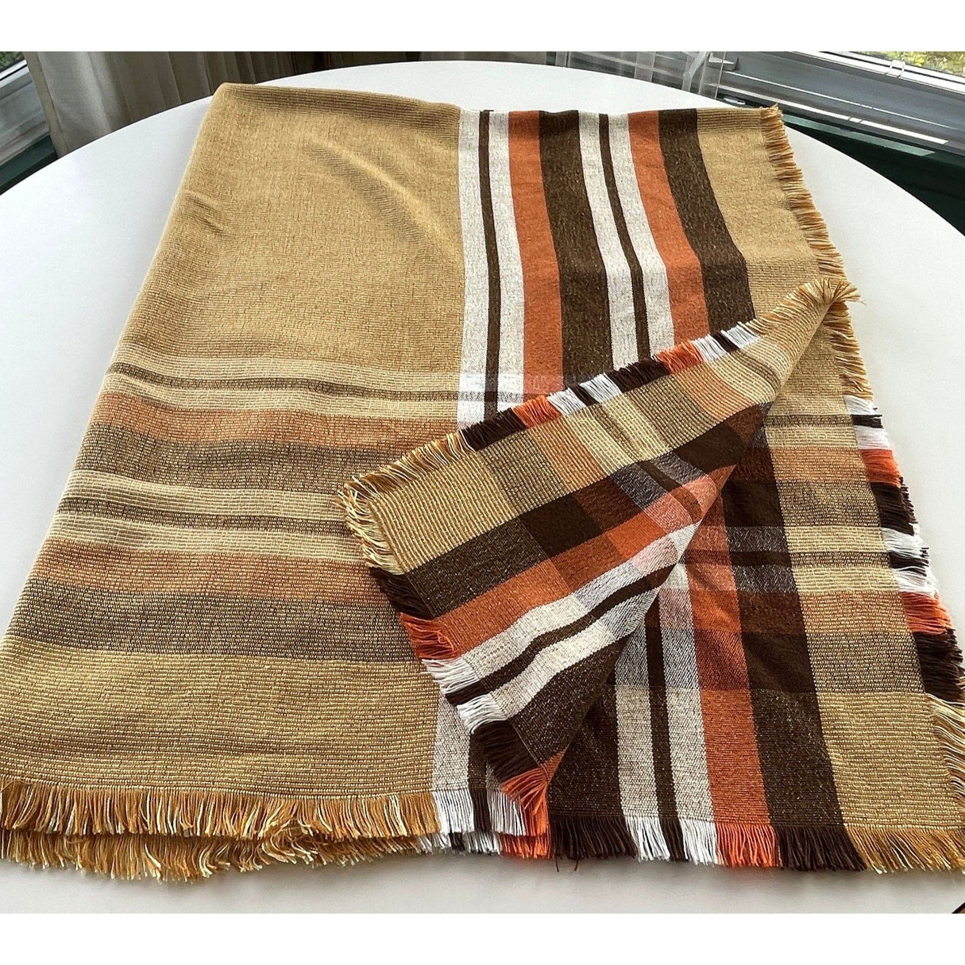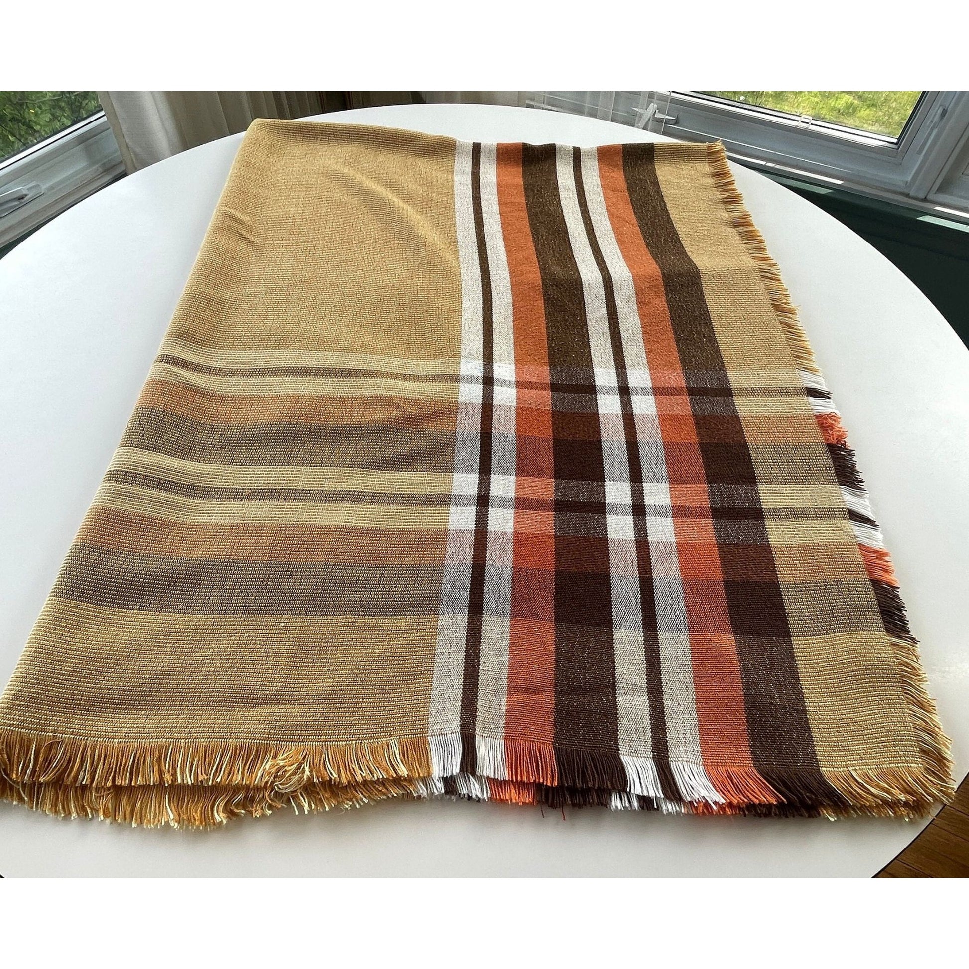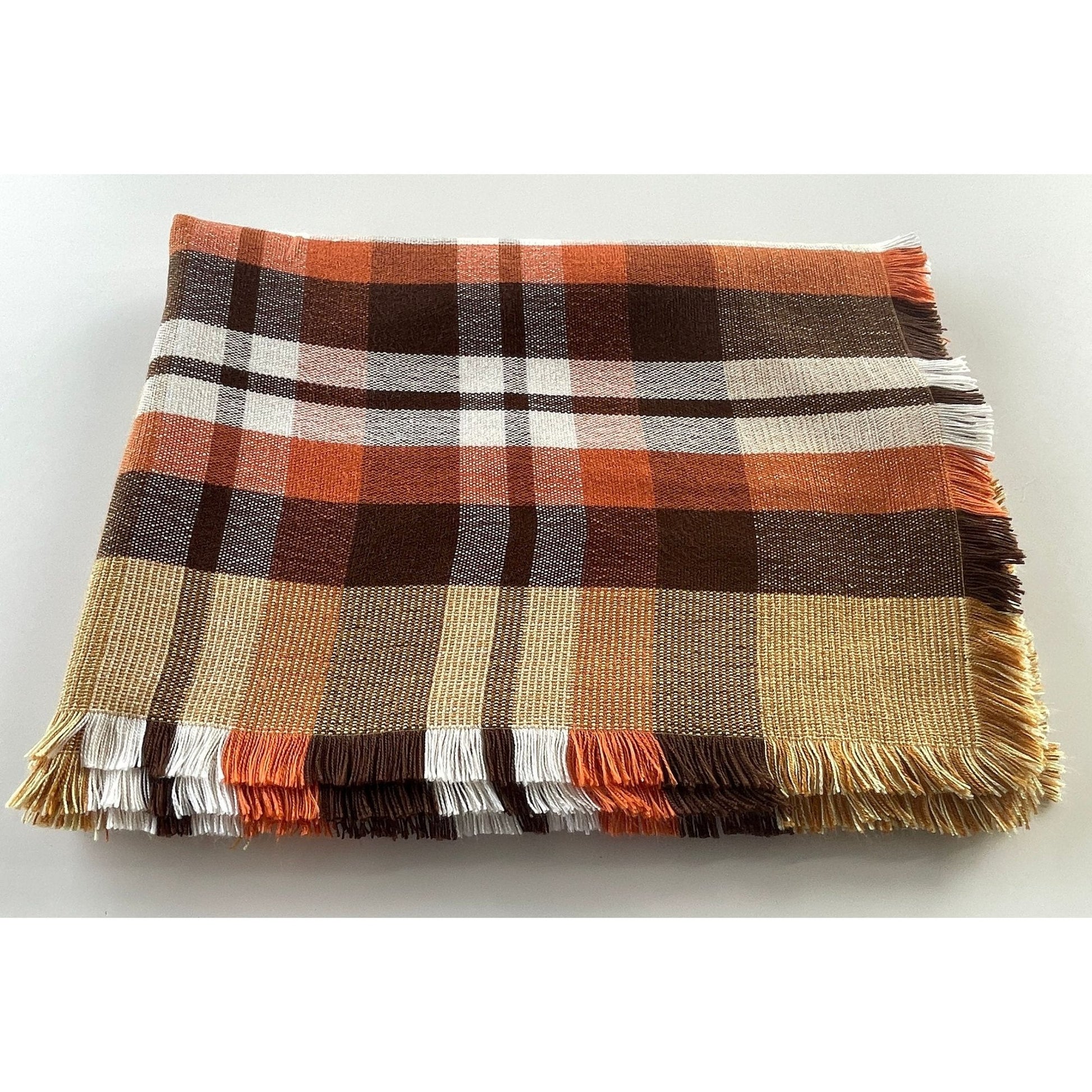 Fringed, woven fabric, with orange brown and white stripes in a plaid pattern.