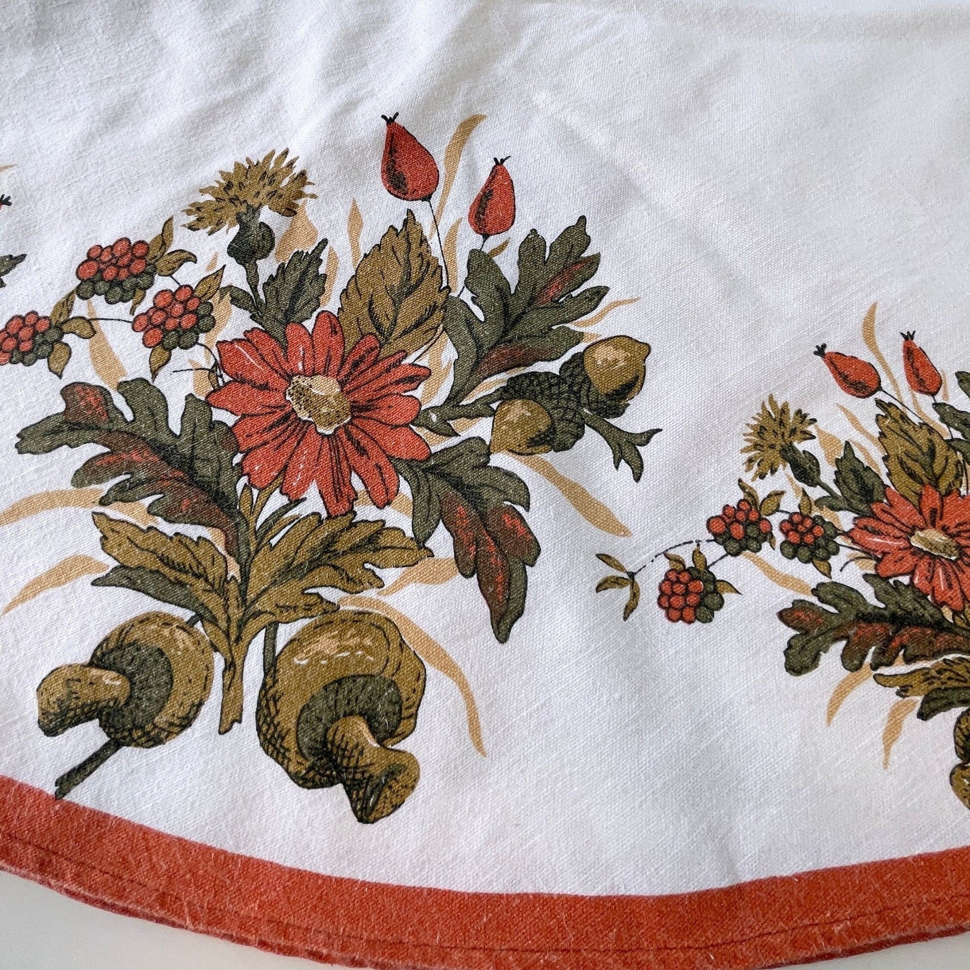 vintage 80s round tablecloth, flowers and mushroom orange and brown print