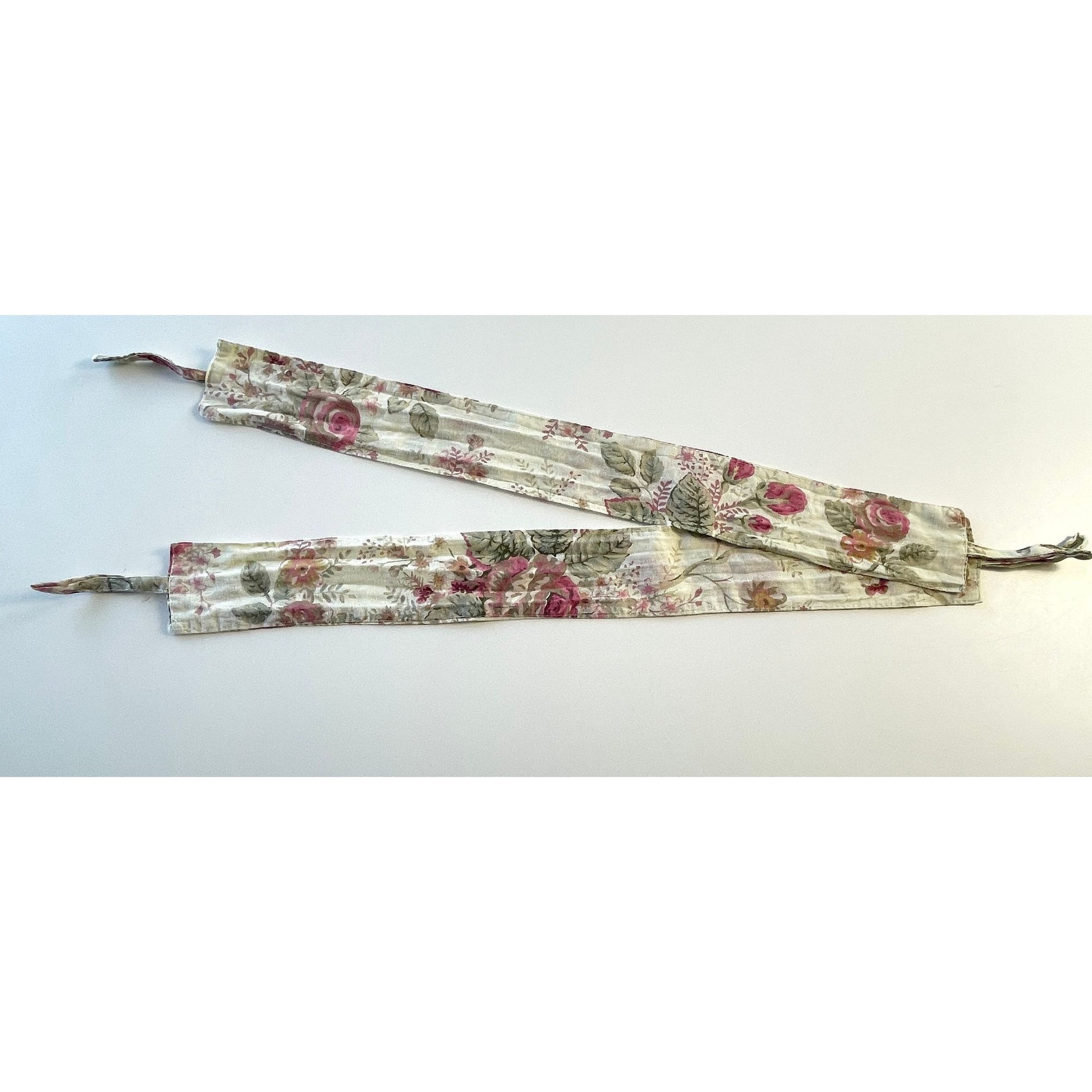 Very feminine window treatment, beige background with pink roses and greenery. Panel is lined and has its assorted tieback.