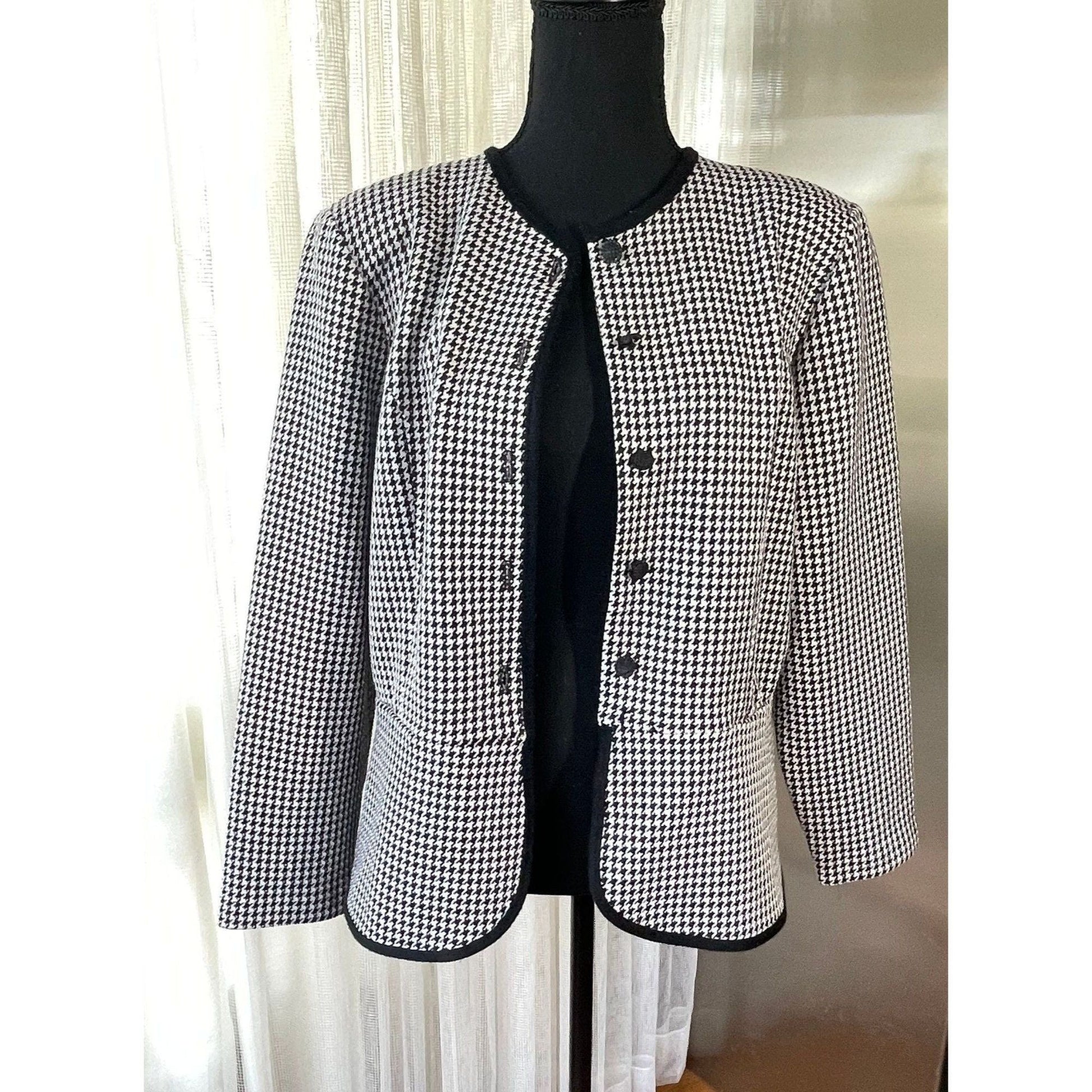 Cute 80s houndstooth jacket/blazer, made in Canada by D'Allaird's. Plastic buttons on the front, black trim all around with a crew neckline, this blazer would look amazing over jeans or leggings.