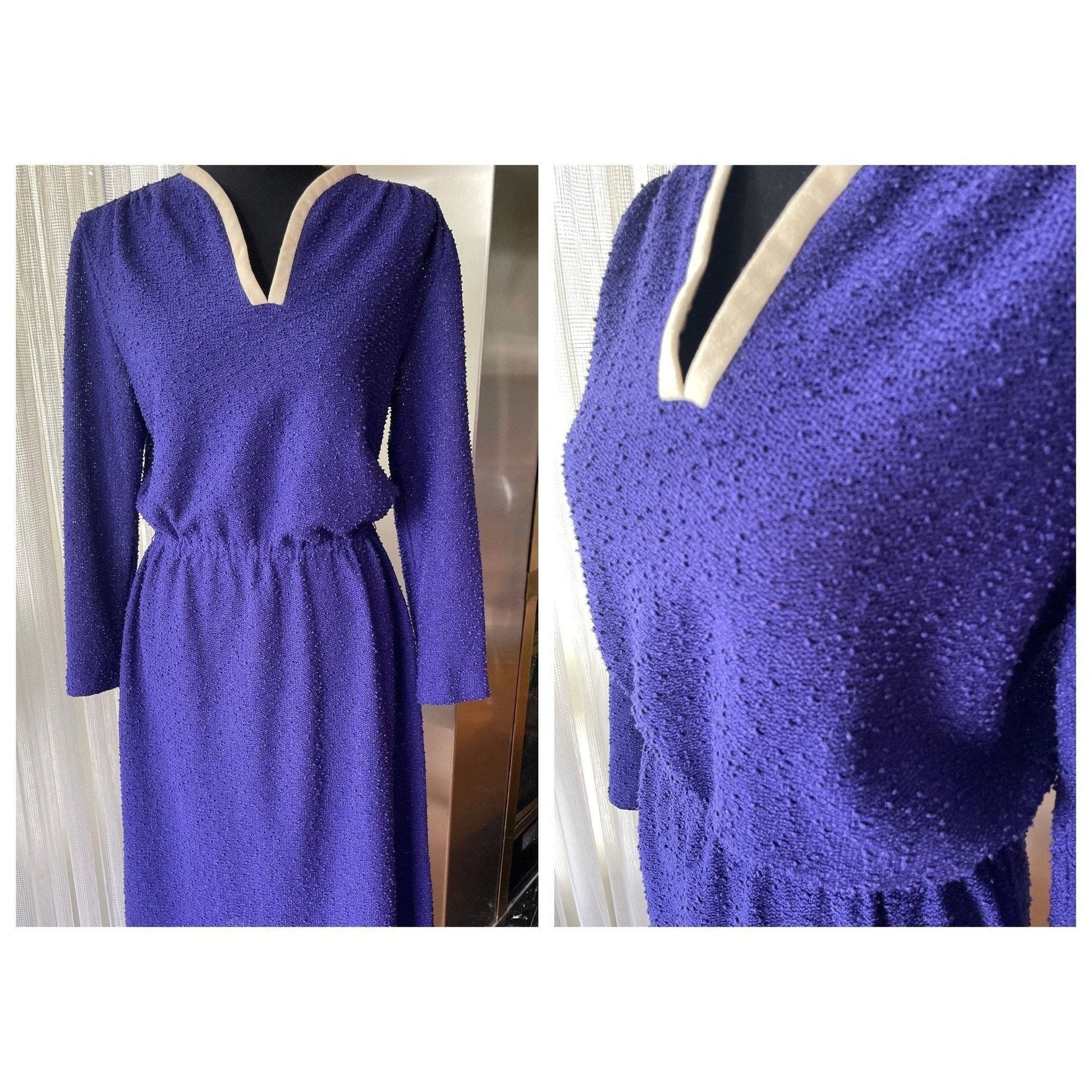 Gorgeous 60s/70s dress, long sleeves with a deep V neckline; the neckline has a beige detailed trim. waist is elastic and it has loops for a belt, not included. Union made by R&K originals