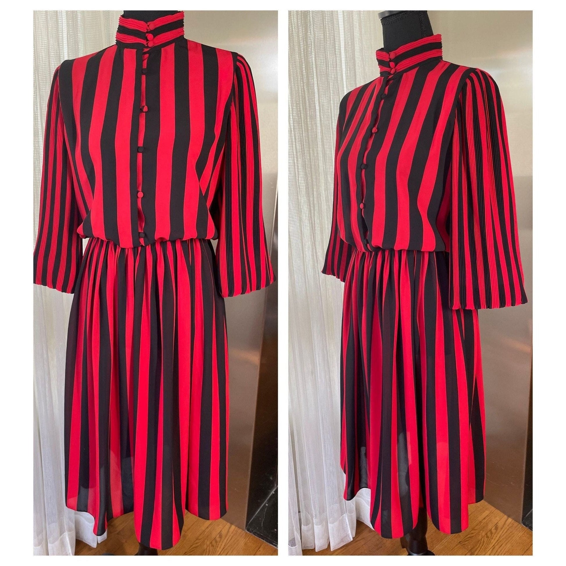 Adorable shirtdress from the 70s, black and red stripes with 3/4 length bishop sleeves and elastic waist. The sleeves are ribbed and puffy at the end. The mock neck is buttoned up and the buttons go down to the waist.