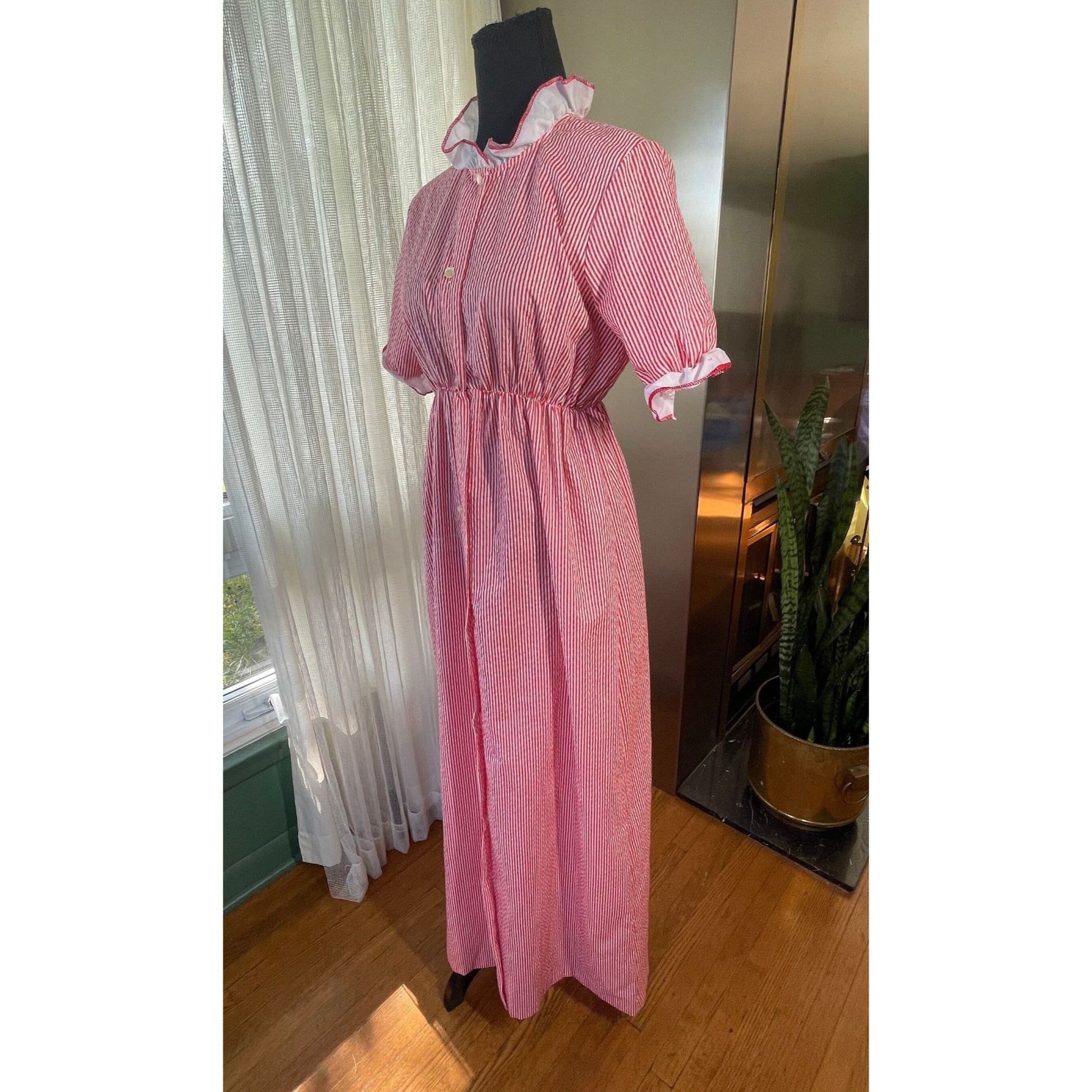 Adorable ankle length shirtdress from the 70s, red and white stripes with 3/4 length sleeves and elastic waist. The sleeves and the collar are both ruffled with contrasting white material. The front is buttoned from the neck to the bottom.