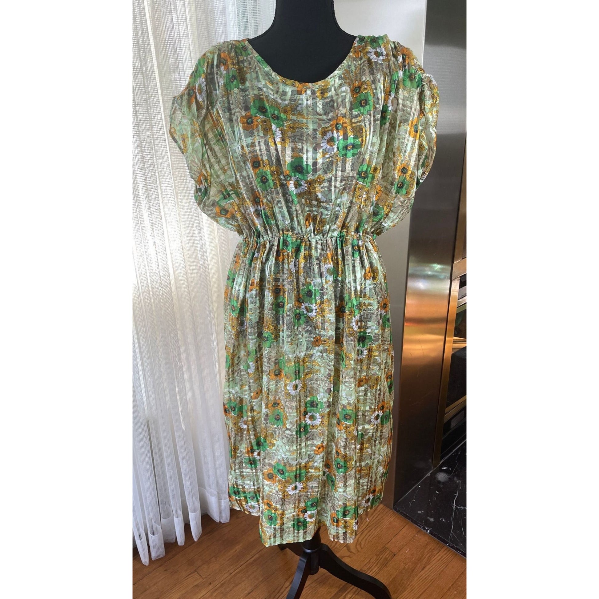 Lovely 80s summer dress, no tag for a maker. Round crew neckline, dropped shoulders sleeves. Elastic waist.