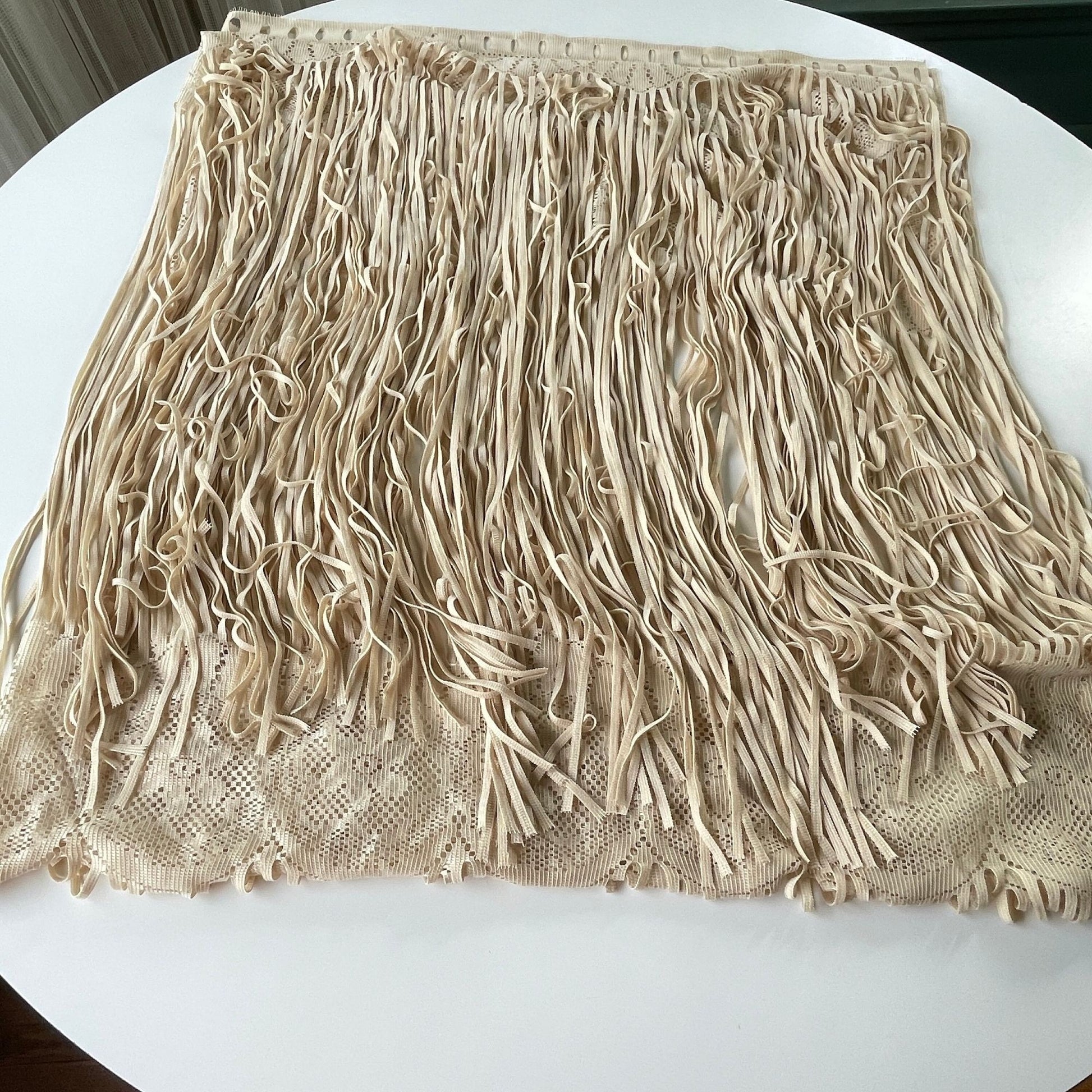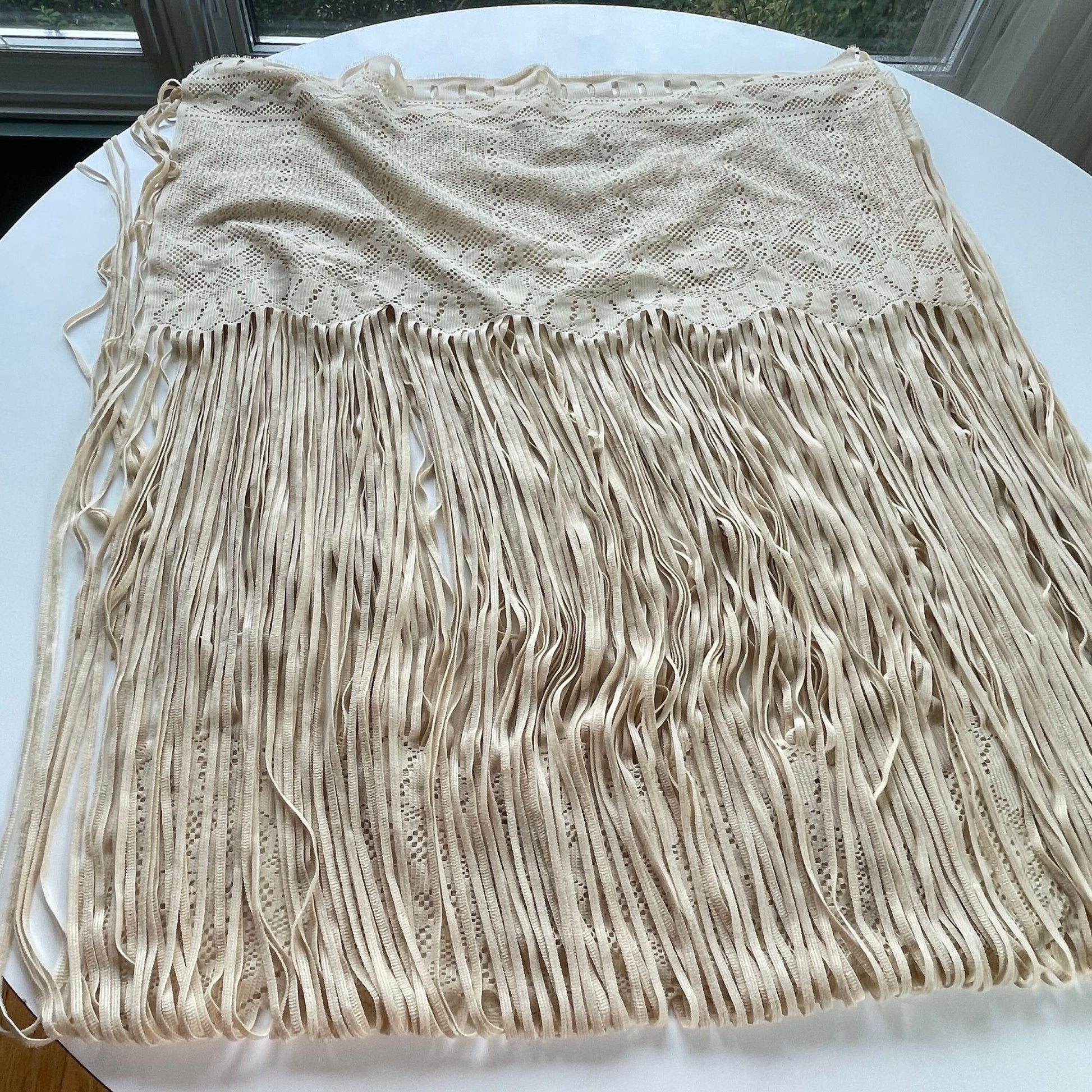 Ecru/tan color, this is a contemporary machine made lace, with string fringes in between each lace part.