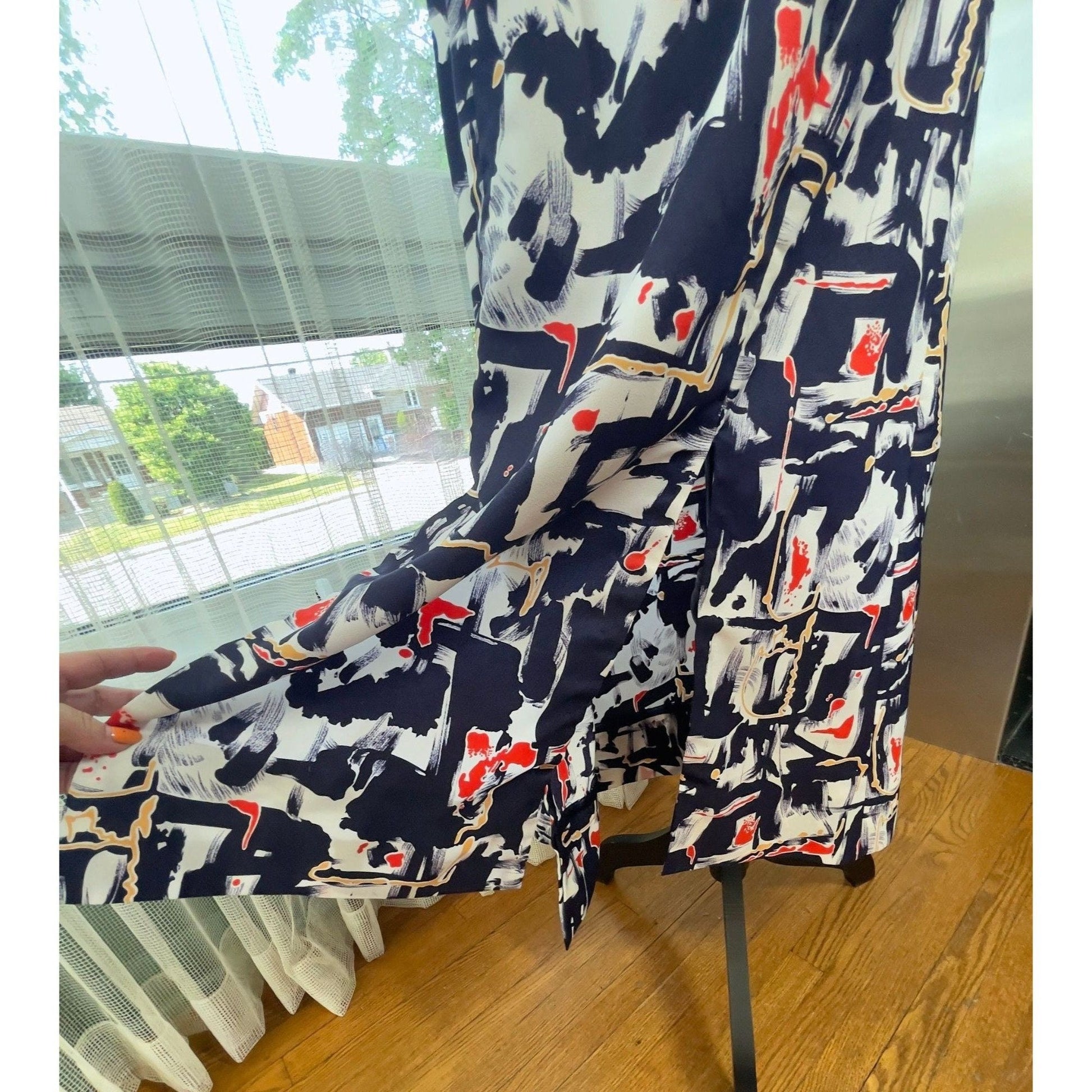 Awesome 1970 sheath maxi dress, in bold geometric pattern. Asian inspired with the high turtleneck, double slit at the bottom front and bell sleeves. Zips on the back. No label, likely handmade.