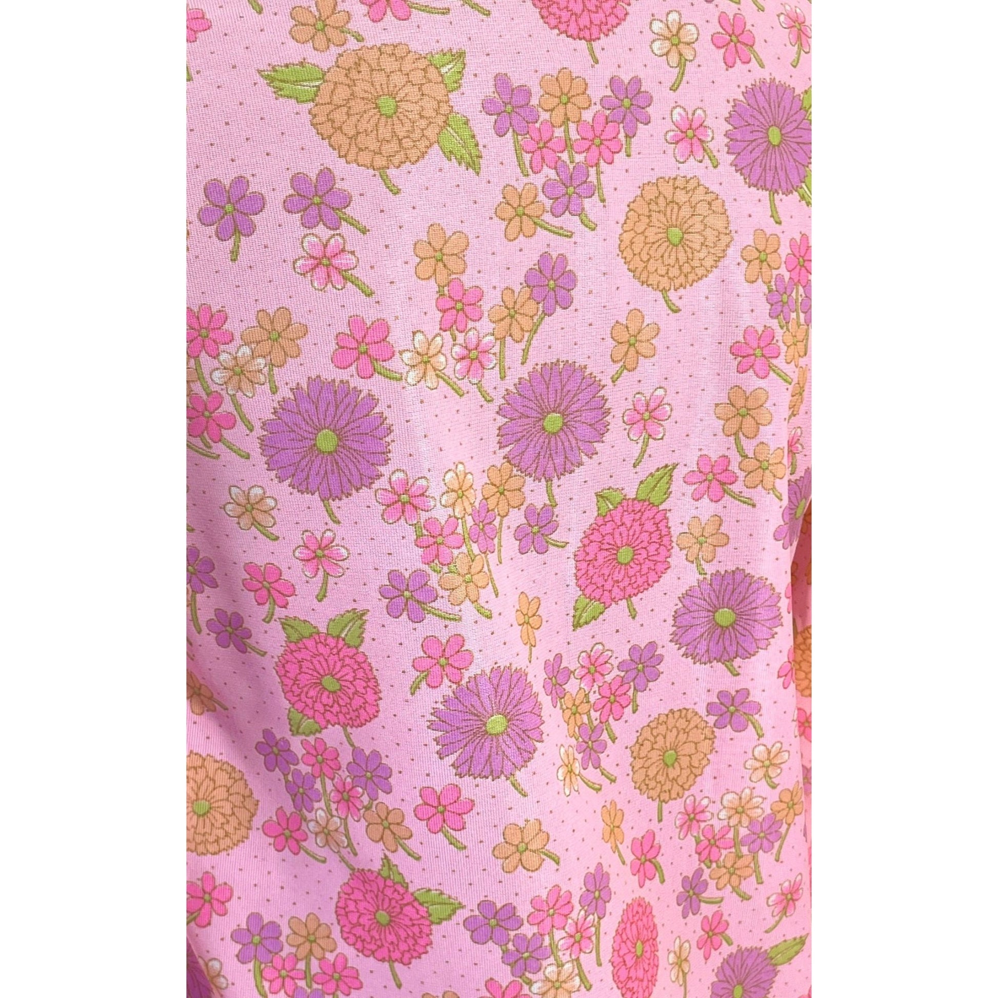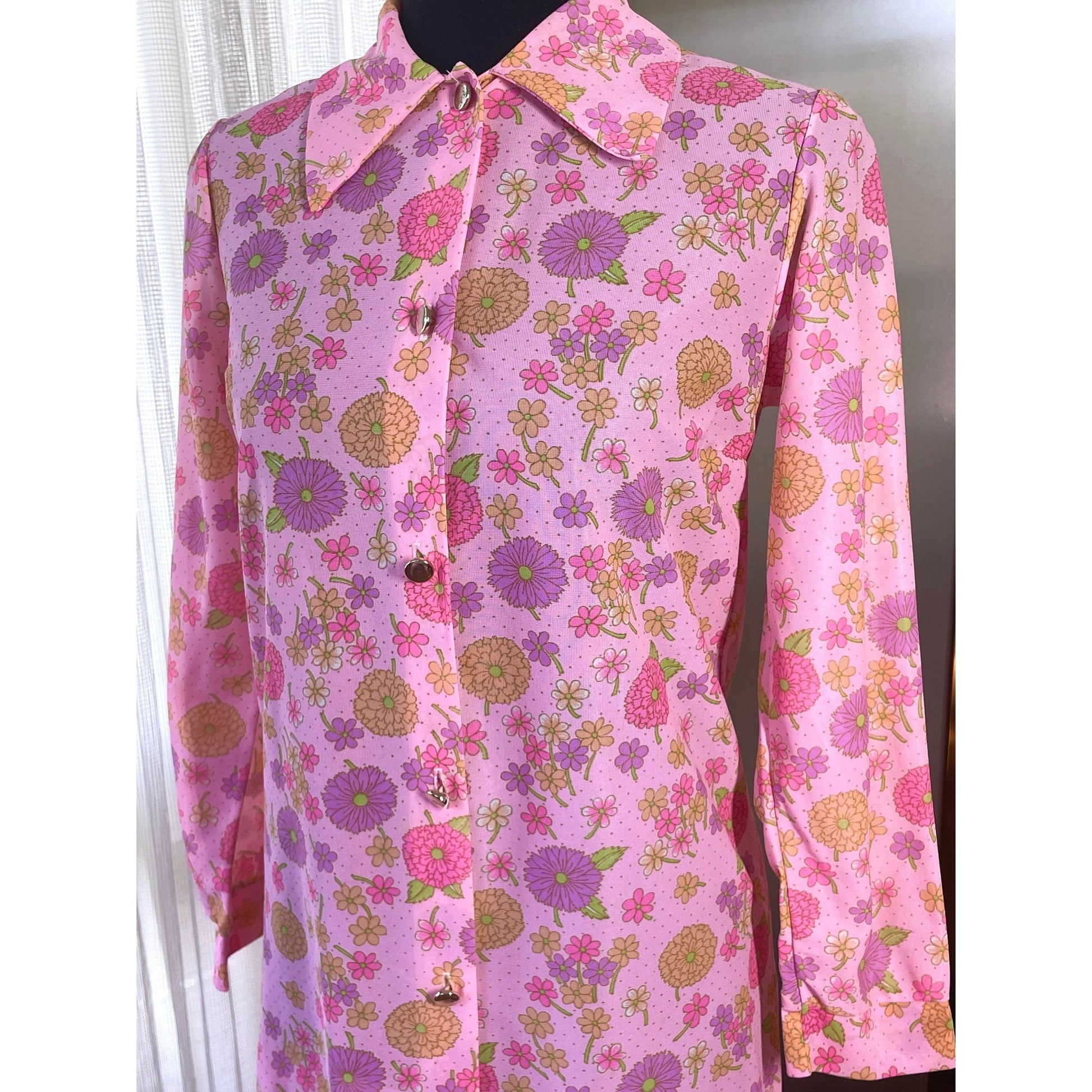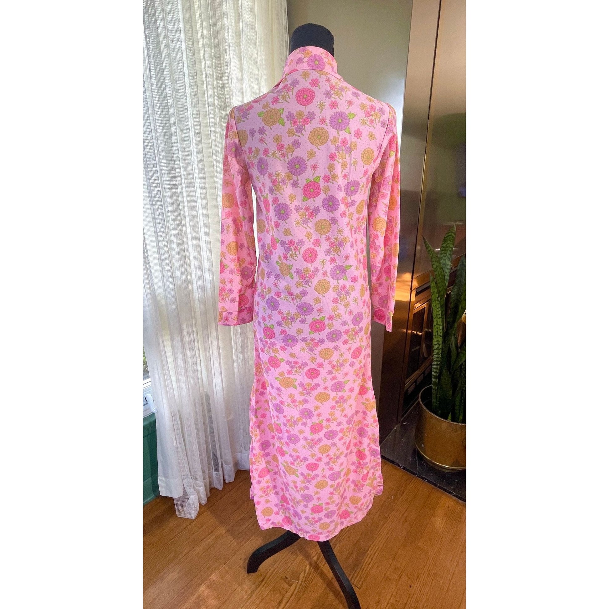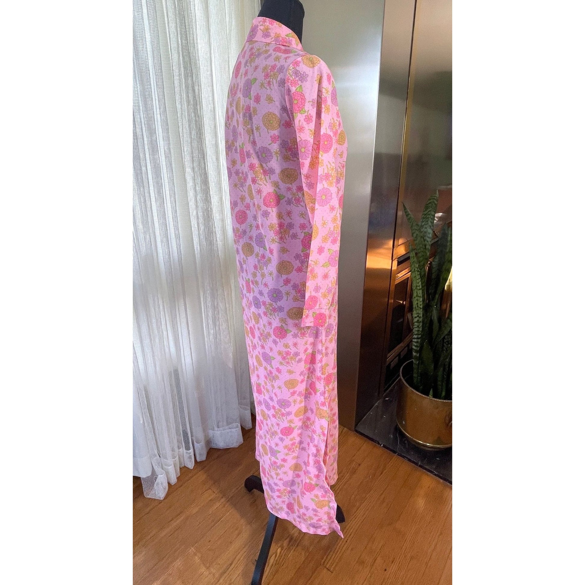 Full length buttons on front, long sleeves, pink and purple flower power pattern. The dress has a collar and side slits on the bottom. It is just above ankle length, could be worn open over another garment, as a robe or a dress.