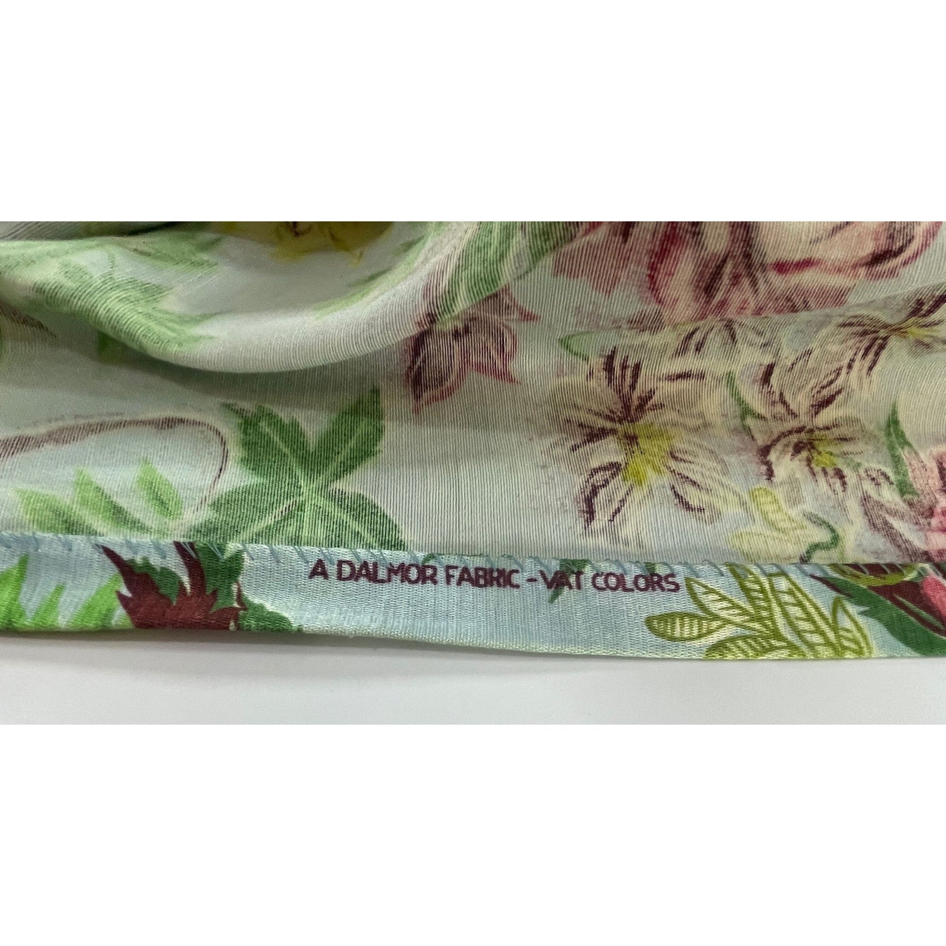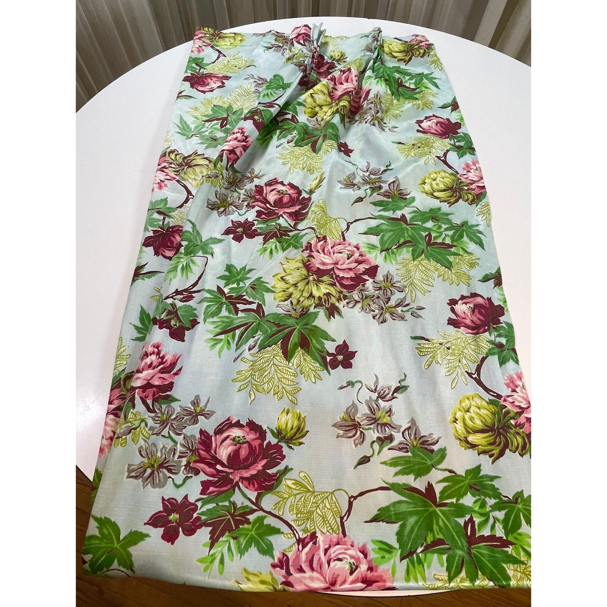 Gorgeous powder blue with bold and large colorful pink flowers with greenery pattern, this panel is shiny, with a very good weight. It was made by Dalmor and gives a rich feeling to any window.