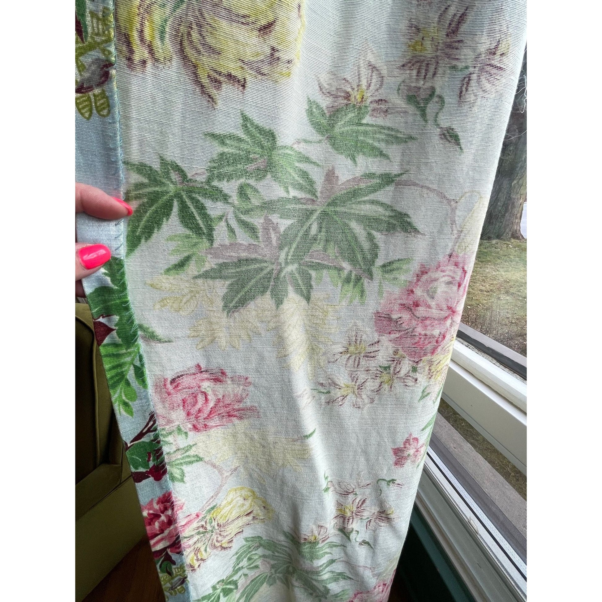 Vintage MCM pleated floral curtain panel, robin egg blue, pink yellow floral, greenery