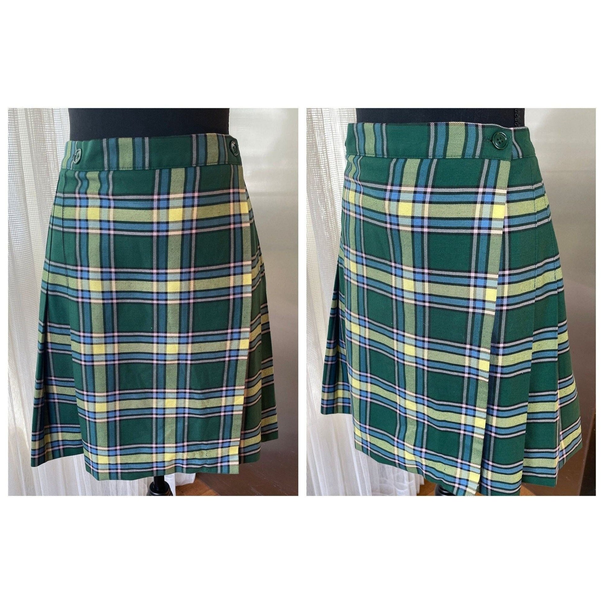 Cute early 80s student plaid pleated mini skirt. This pleated plaid skirt has a "student name" tag, it was likely a school uniform.Made in Canada by Top Marks.