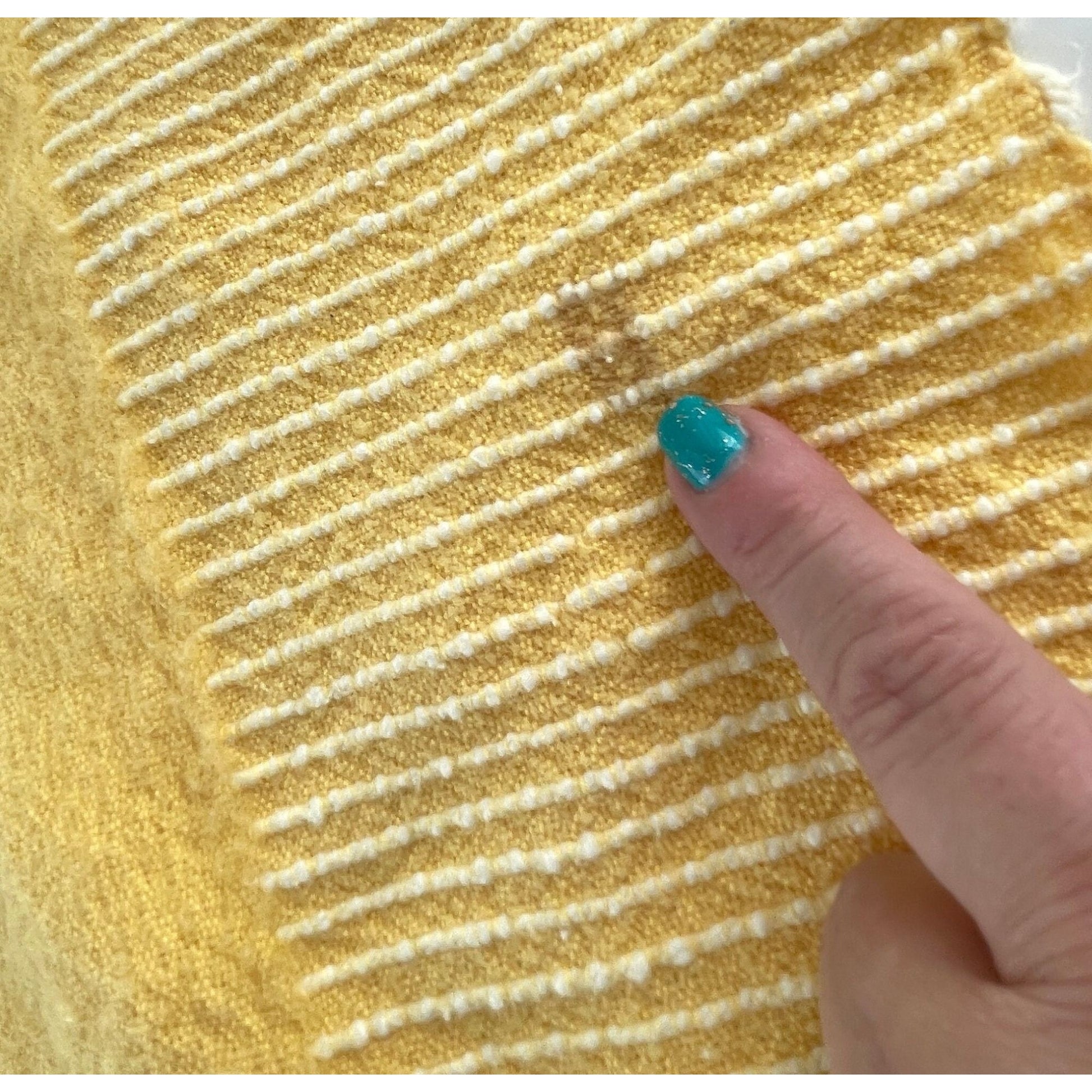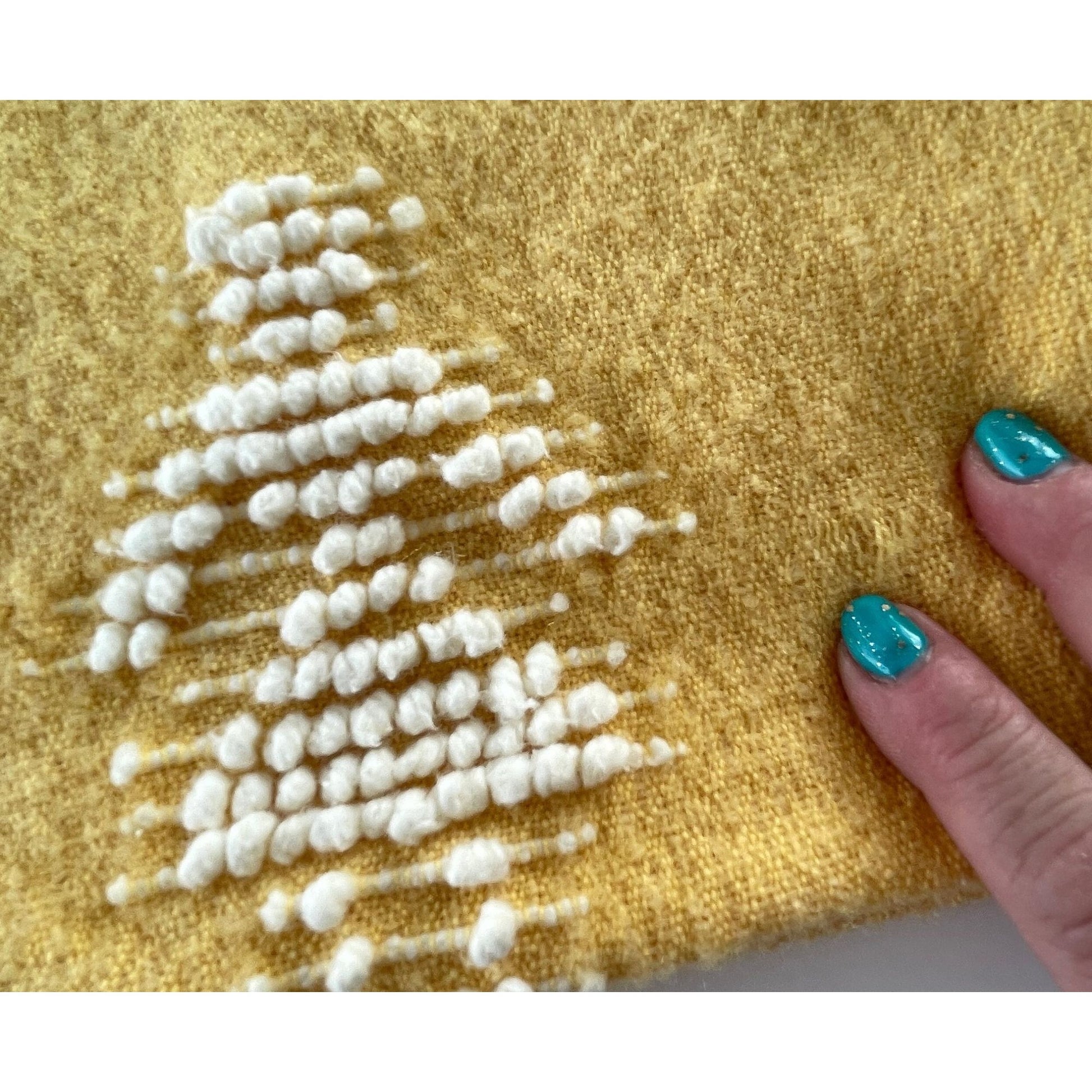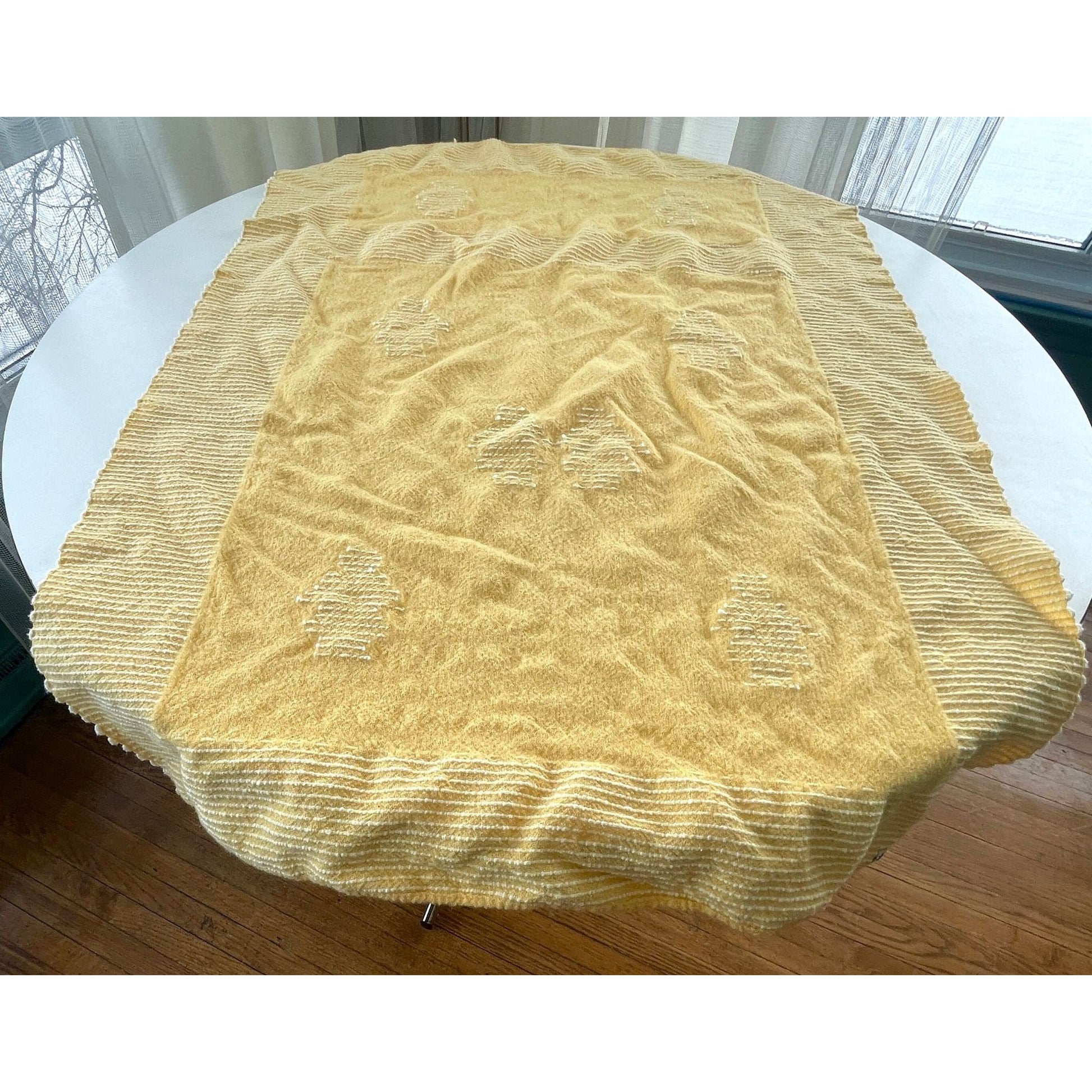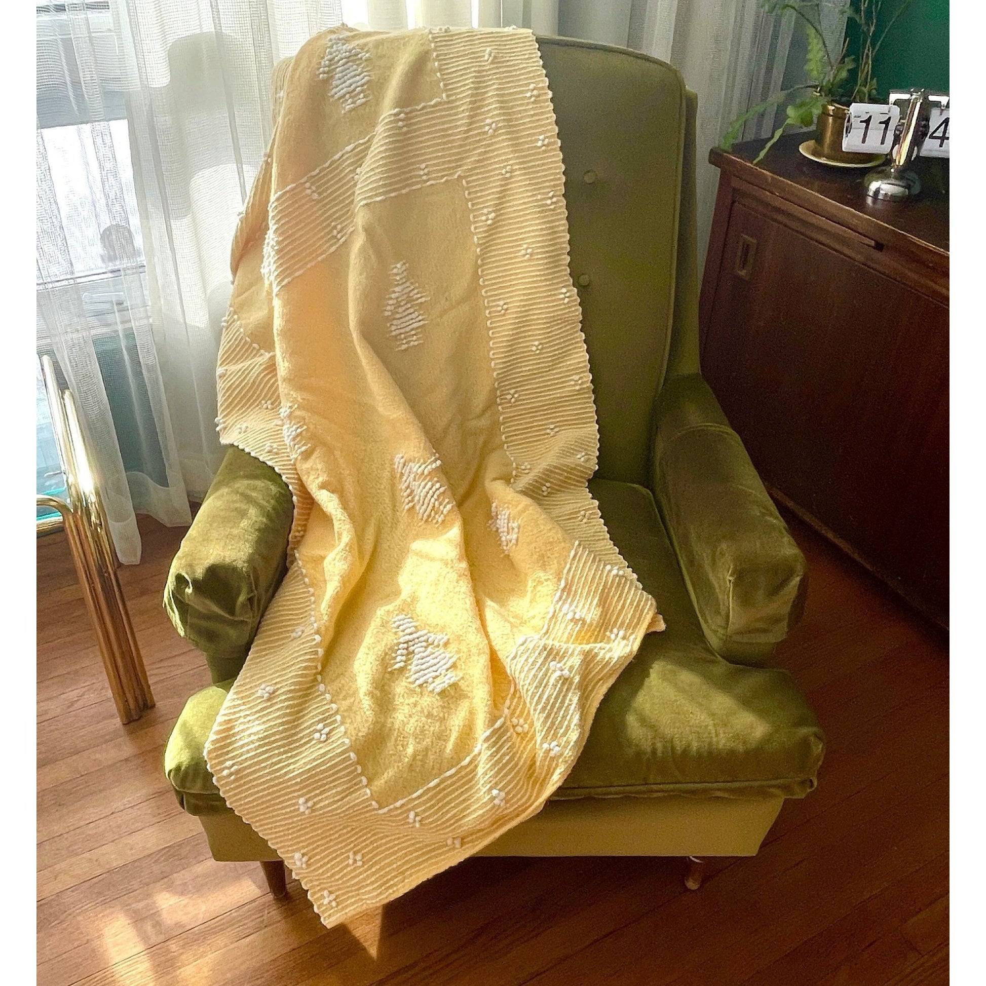 This 80 years old buttery yellow throw is soft, with a hobnail like texture for the pattern of little girls in dresses.