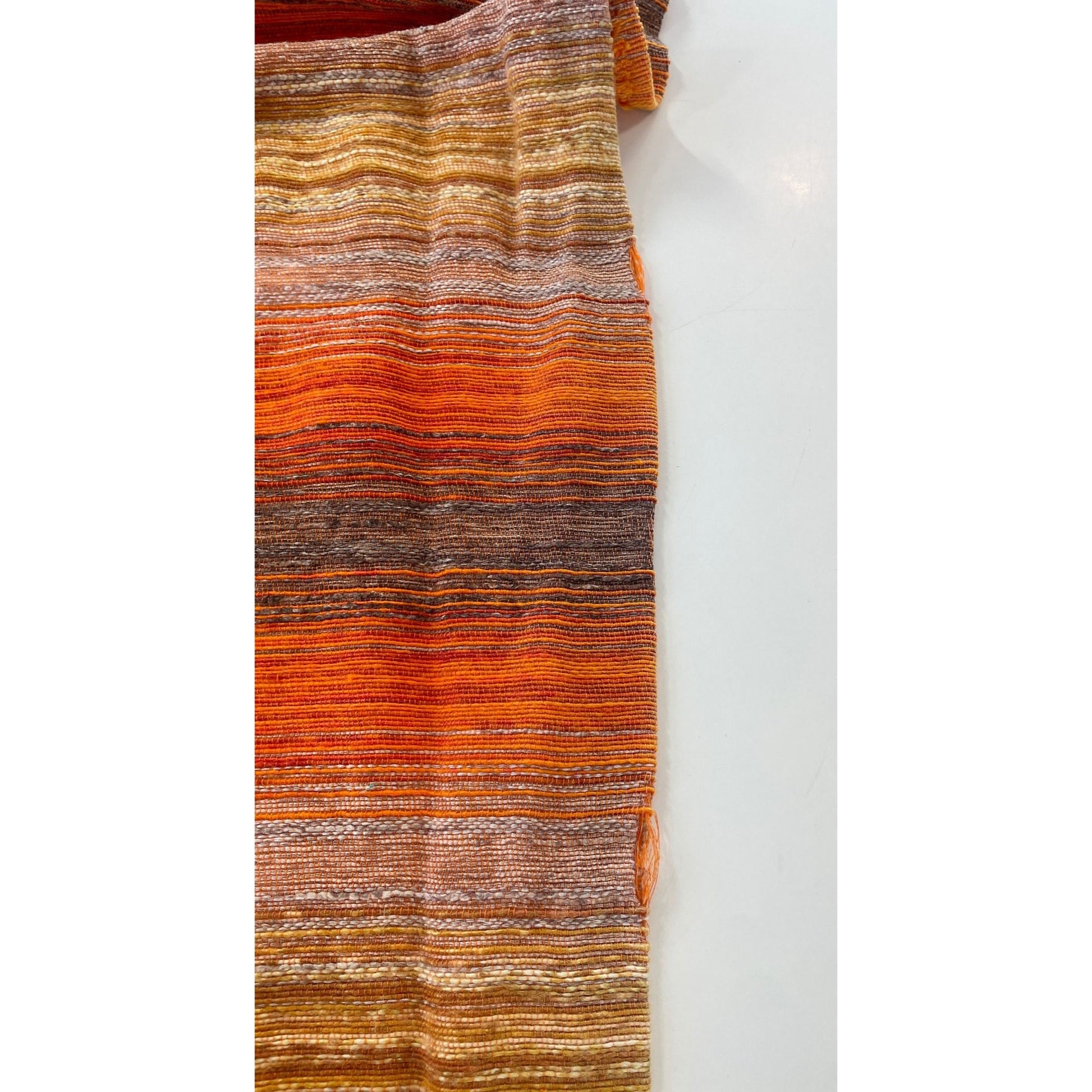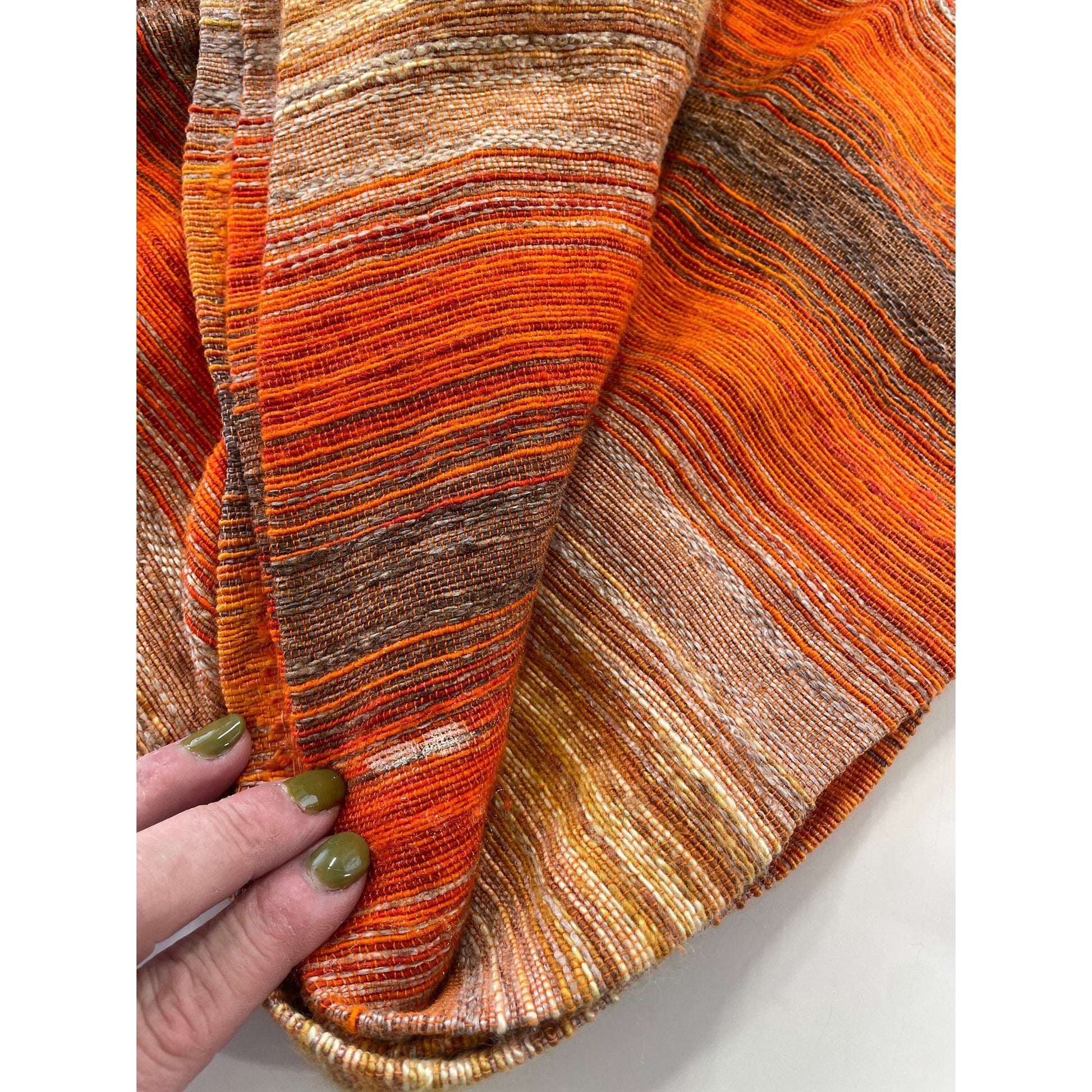 Very 70s curtain, orange brown and tan horizontal stripes in an ombre pattern.