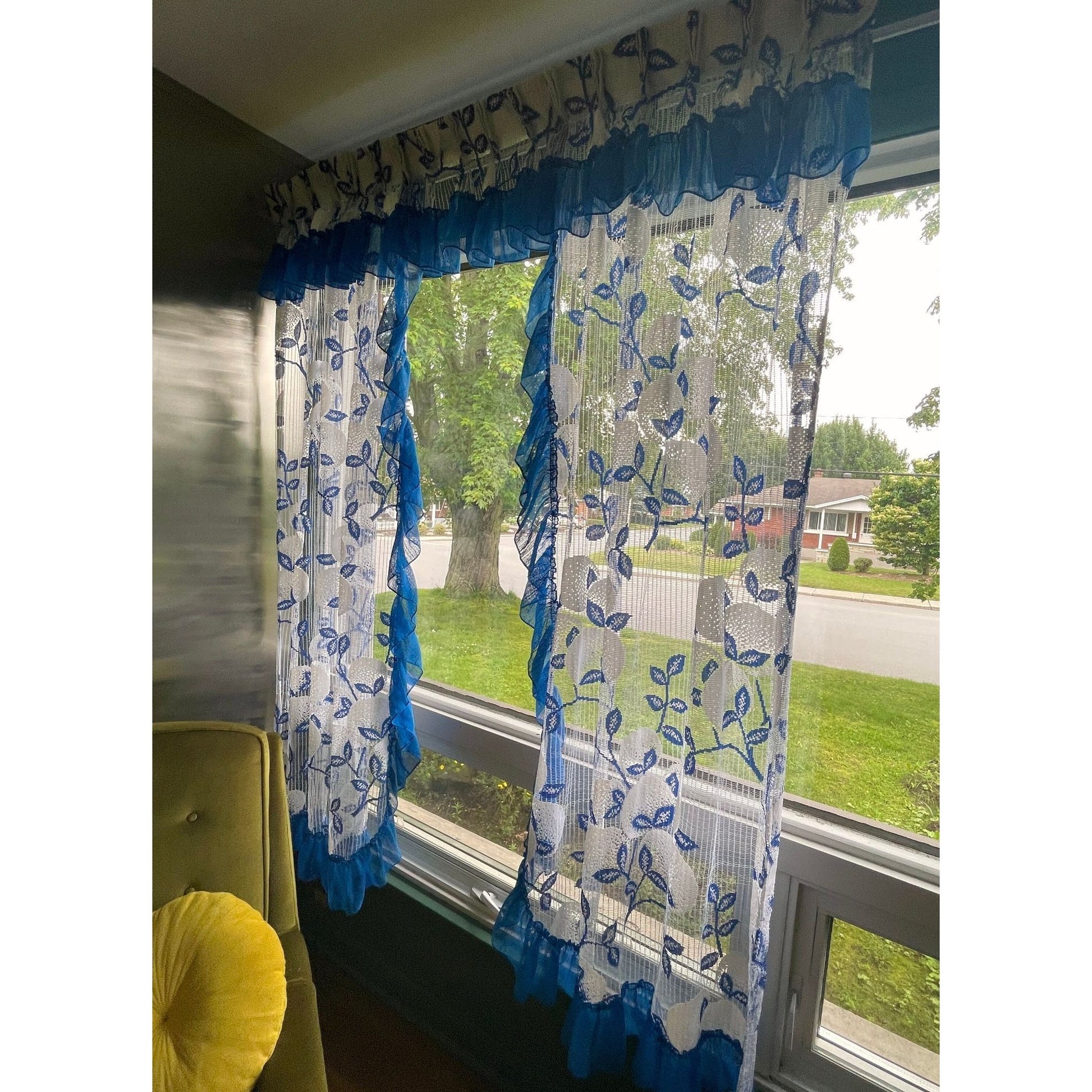 Vintage 80s ruffled double curtains, royal blue, white mesh