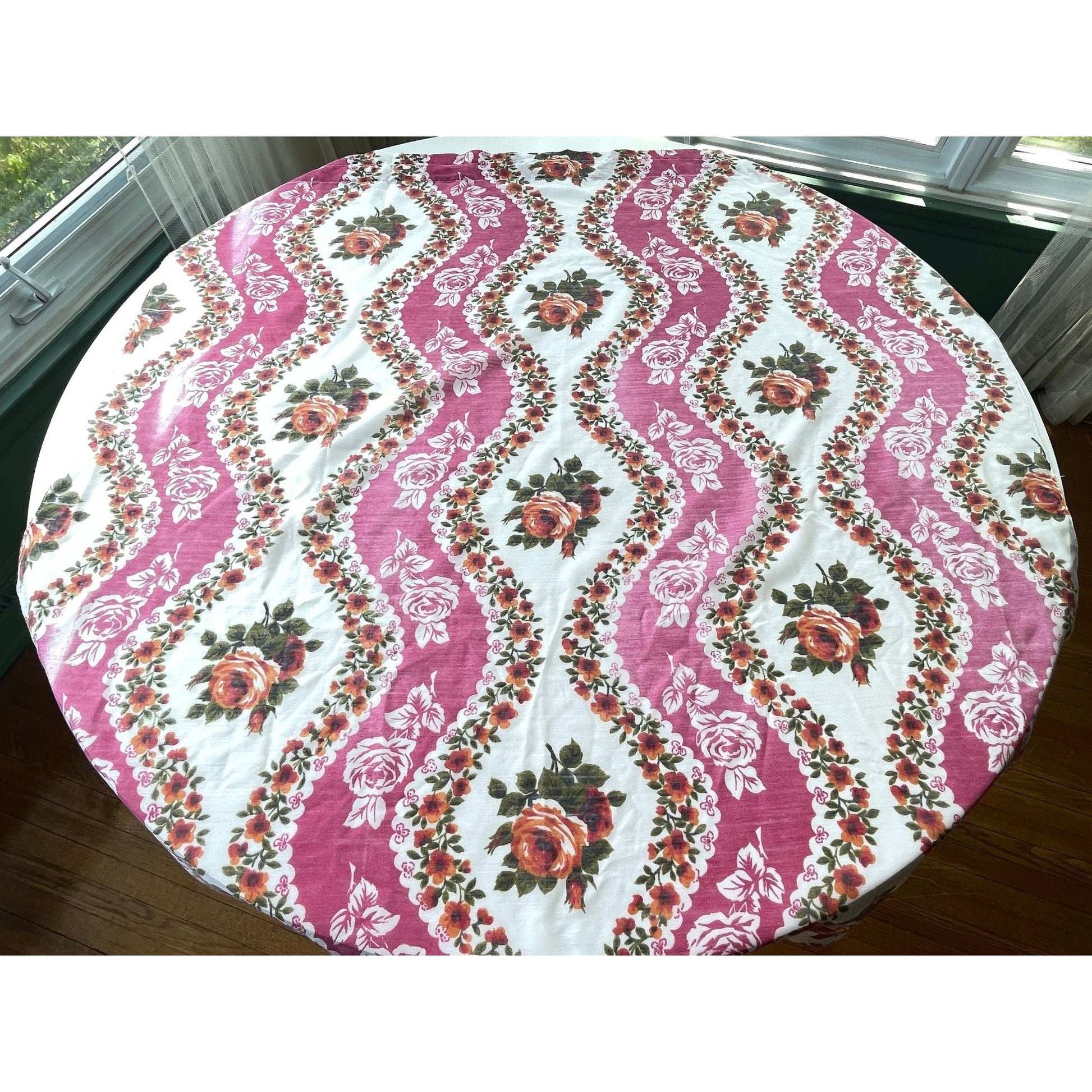 Hot pink floral pattern over a white background; no label so material is unknown, it is sheer and feels like a synthetic blend.