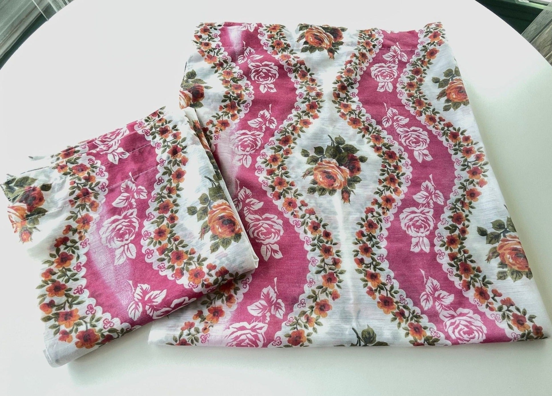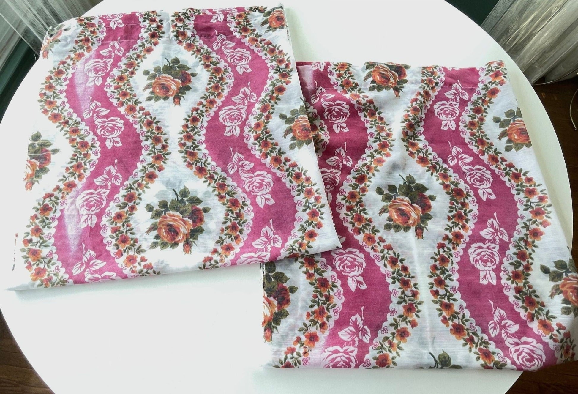 Vintage 70s curtains, pink floral sheer pair of panels